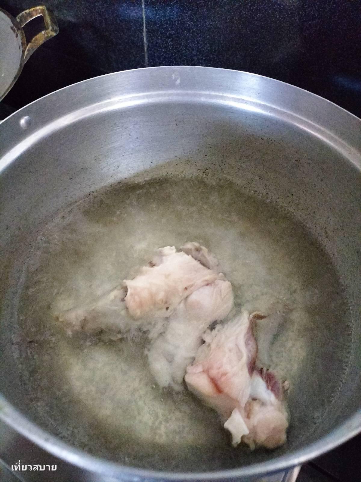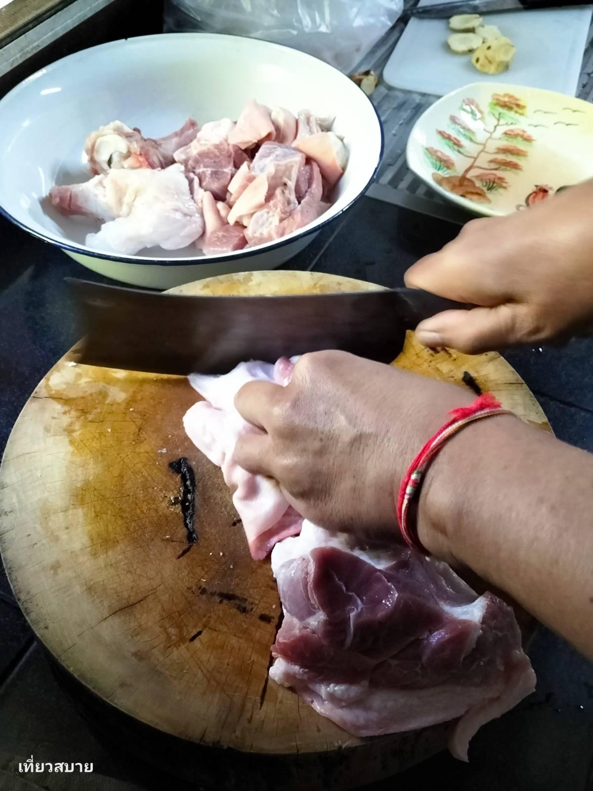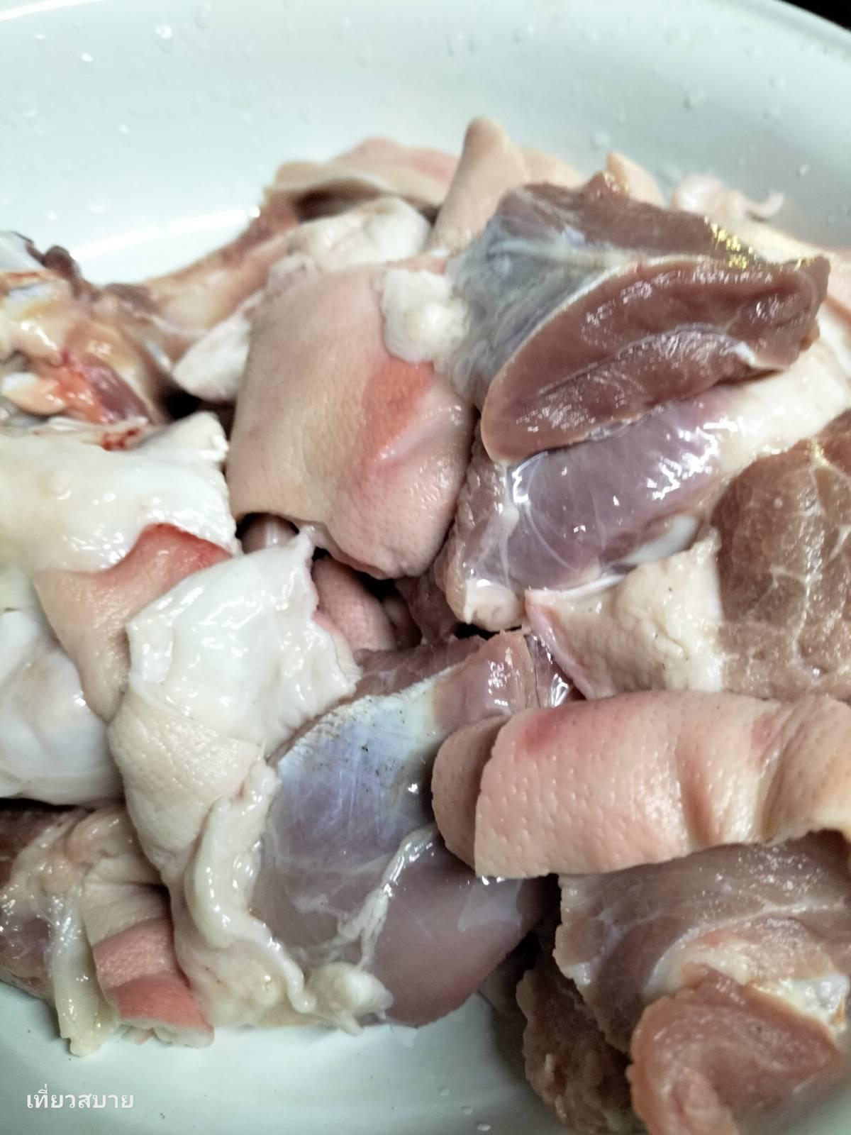 1. ขาหมู: หั่นชิ้น ล้างทำความสะอาดให้เรียบร้อย