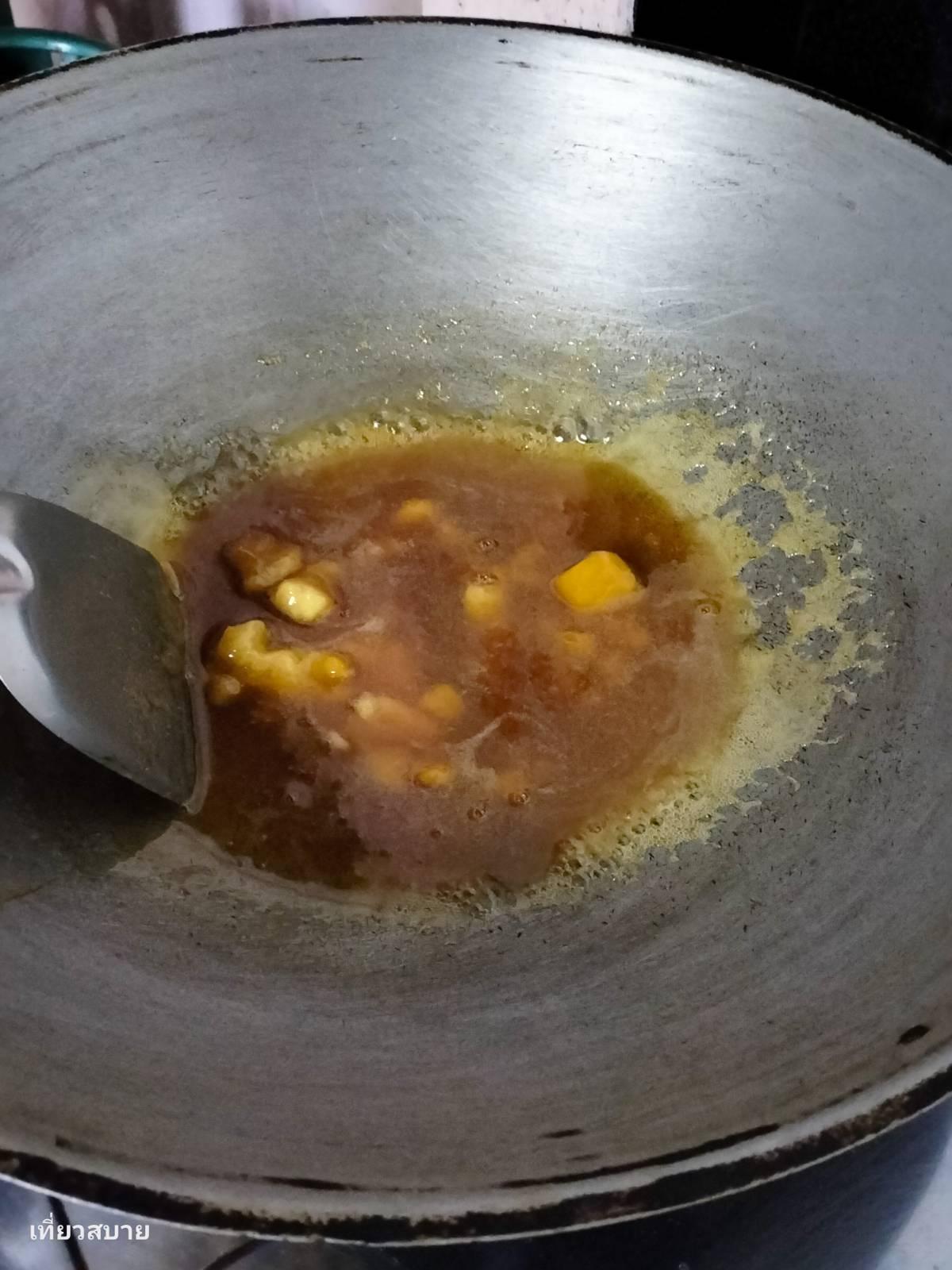 2. เคี่ยวน้ำตาล : เคี่ยวจนน้ำตาลปี๊บละลาย เป็นสีน้ำตาลไหม้สวยๆ ขั้นตอนนี้ต้องระวังอย่าให้ไหม้จนขมนะคะ จากนั้นใส่ผงพะโล้ลงไปผัดด้วย
