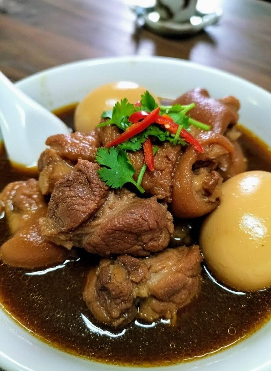 พะโล้ออกมาหน้าตาดีงาม ขาหมูเปื่อยดี น้ำซุปหอม หวานนำเค็มตามแบบนัวๆ และมีความเผ็ดร้อนเล็กๆ จากพริกไทยดำ