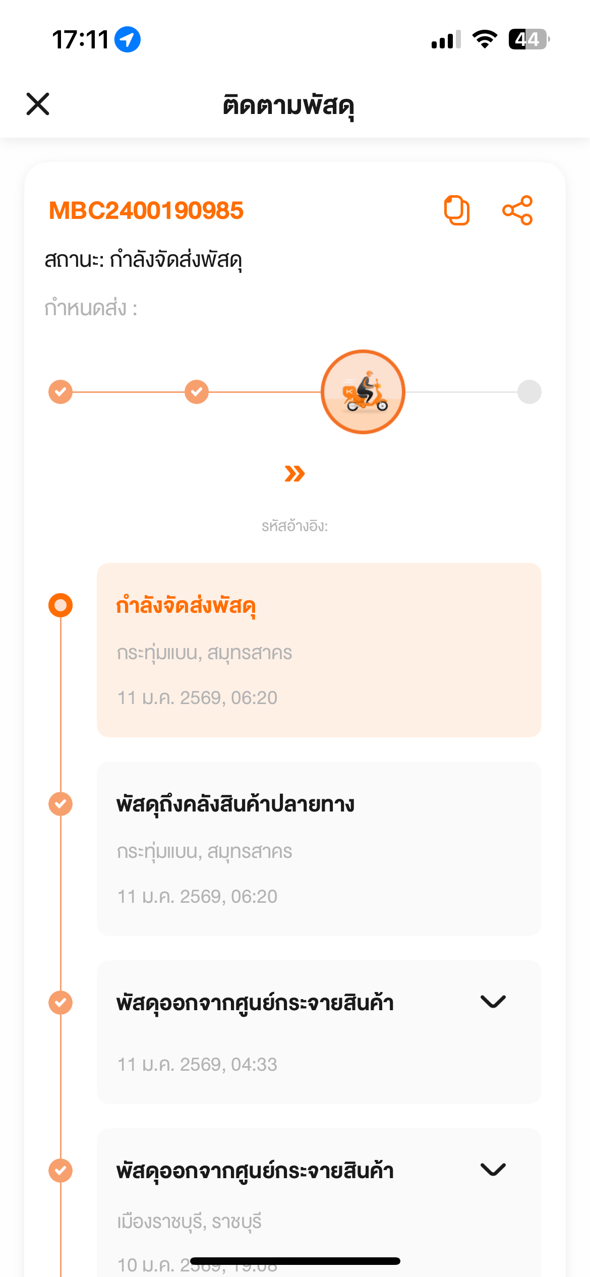 ตรวจสอบสถานะจัดส่งขึ้นมาแบบนี้หมายถึงอะไรครับขึ้นจัดส่งตั้งแต่เมื่อวาน ตอน 08:32 ของวันที่ 10-ม.ค-69 จนตอนนี้นิ่งไปเลยไม่มีการอัพเดท