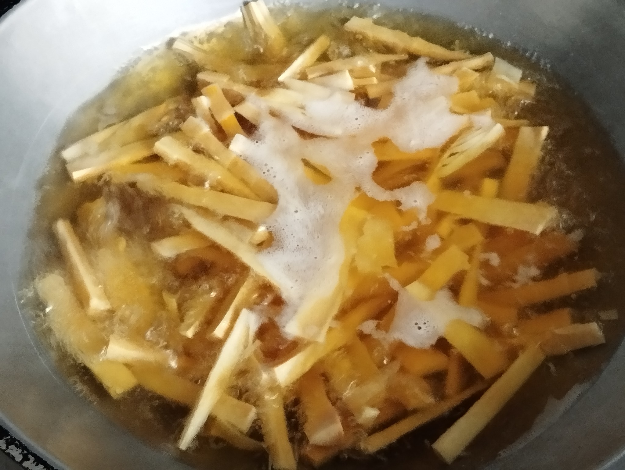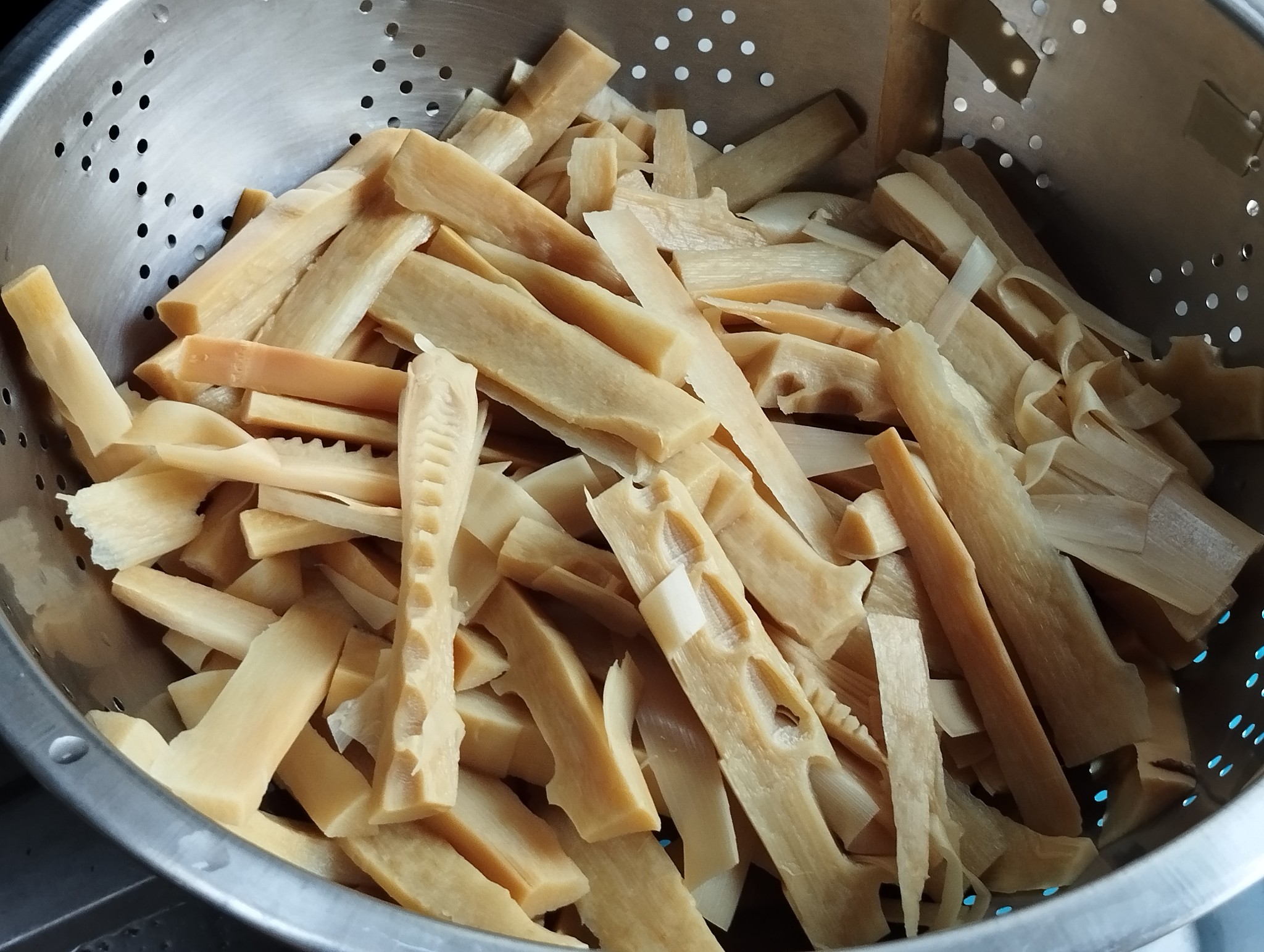 ถึงเวลาท่าน.ผบก็ลงมือทำโดยมีผมเป็นลูกมือ เริ่มจากหั่นหน่อไม้ให้เป็นเส้นหนาบางตามต้องการ แต่ไม่ควรหนามากเพราะถ้าต้มไม่ถึงมันจะแข็ง ๆ หน่อยตอนกิน จากนั้นก็ล้างหลายน้ำหน่อยแล้วนำมาต้มกับน้ำเปล่า ๆ ซักรอบเพื่อความปลอดภัยจากพิษหน่อไม้ปี๊บ