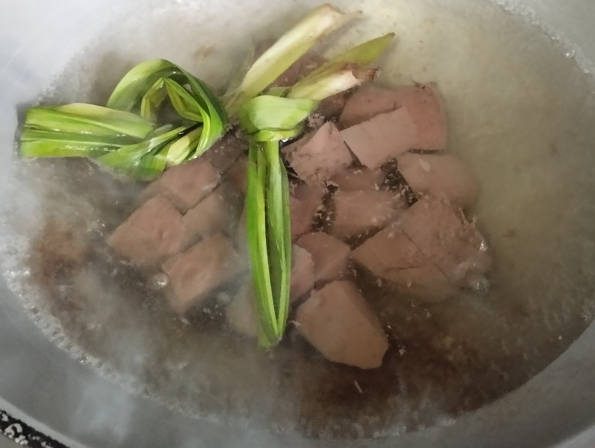 จากนั้นก็ตั้งน้ำอีกรอบ ใส่ใบเตยลงไปต้มด้วยเพื่อที่จะลดความคาวของเลือดไก่ ... ถ้ามี ต้มจนเดือดก็ค่อยใส่เลือดไก่ที่หั่นไว้แล้วลงไปต้ม