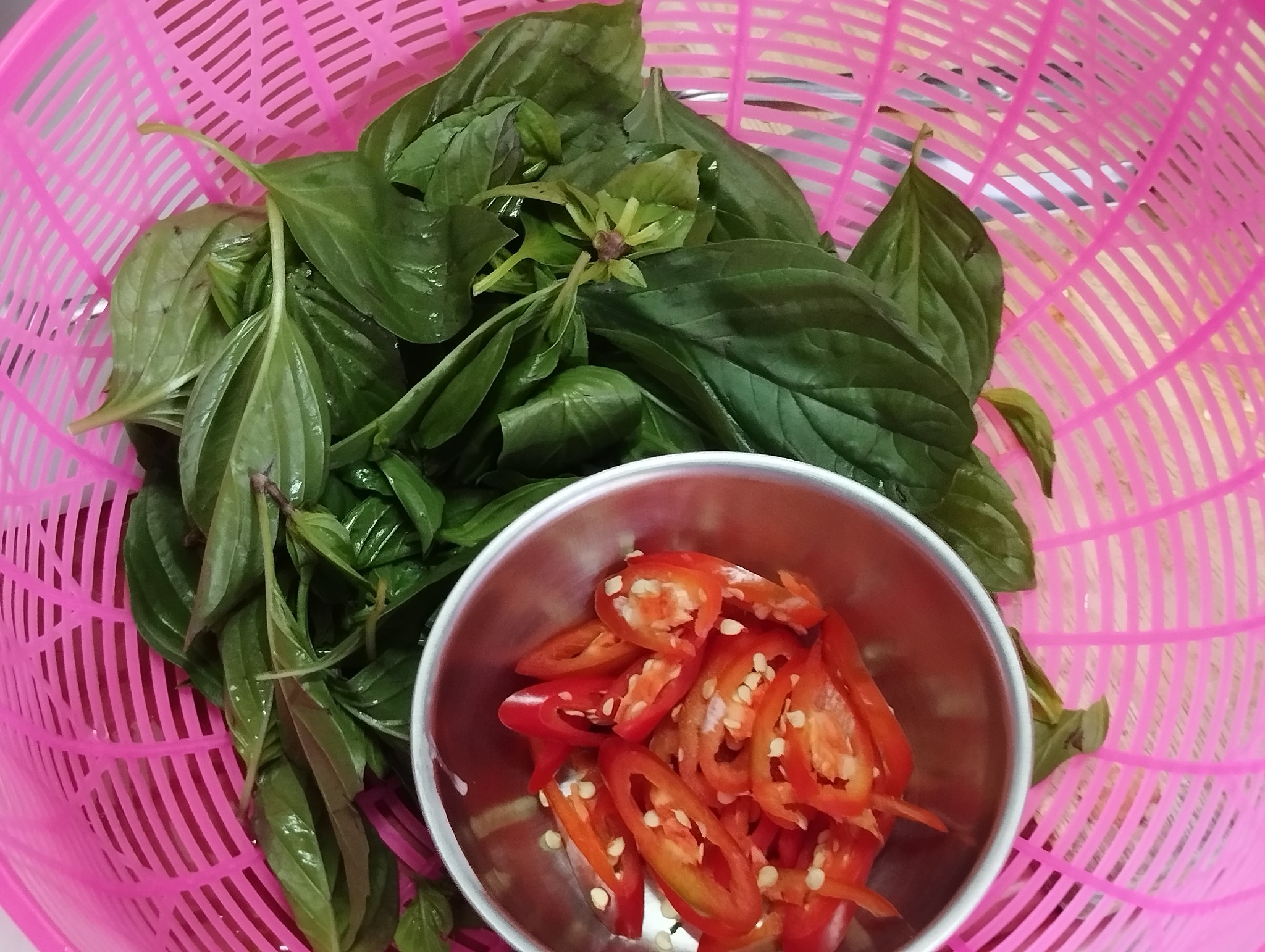 เด็ดใบโหระพา หั่นพริกชี้ฟ้าแดงรอไว้