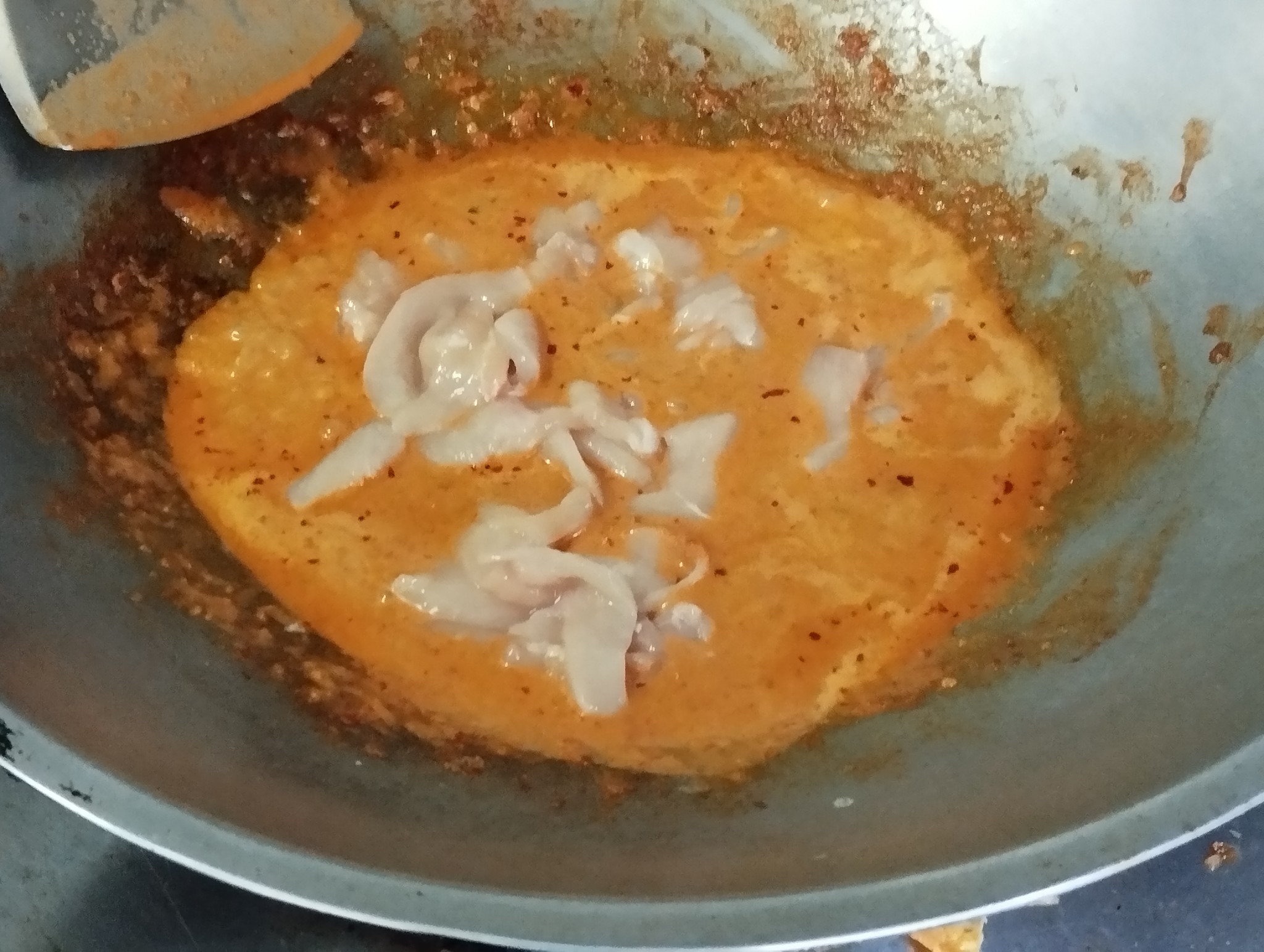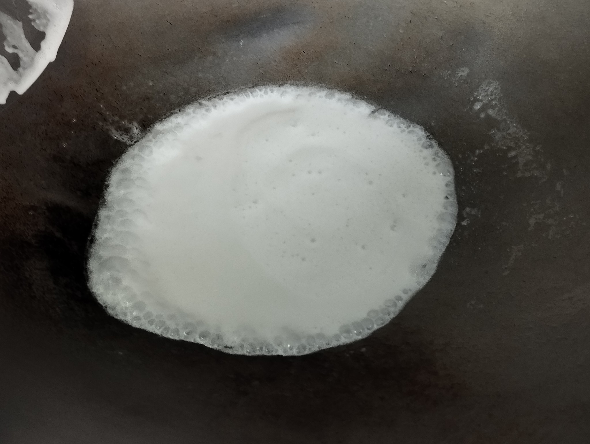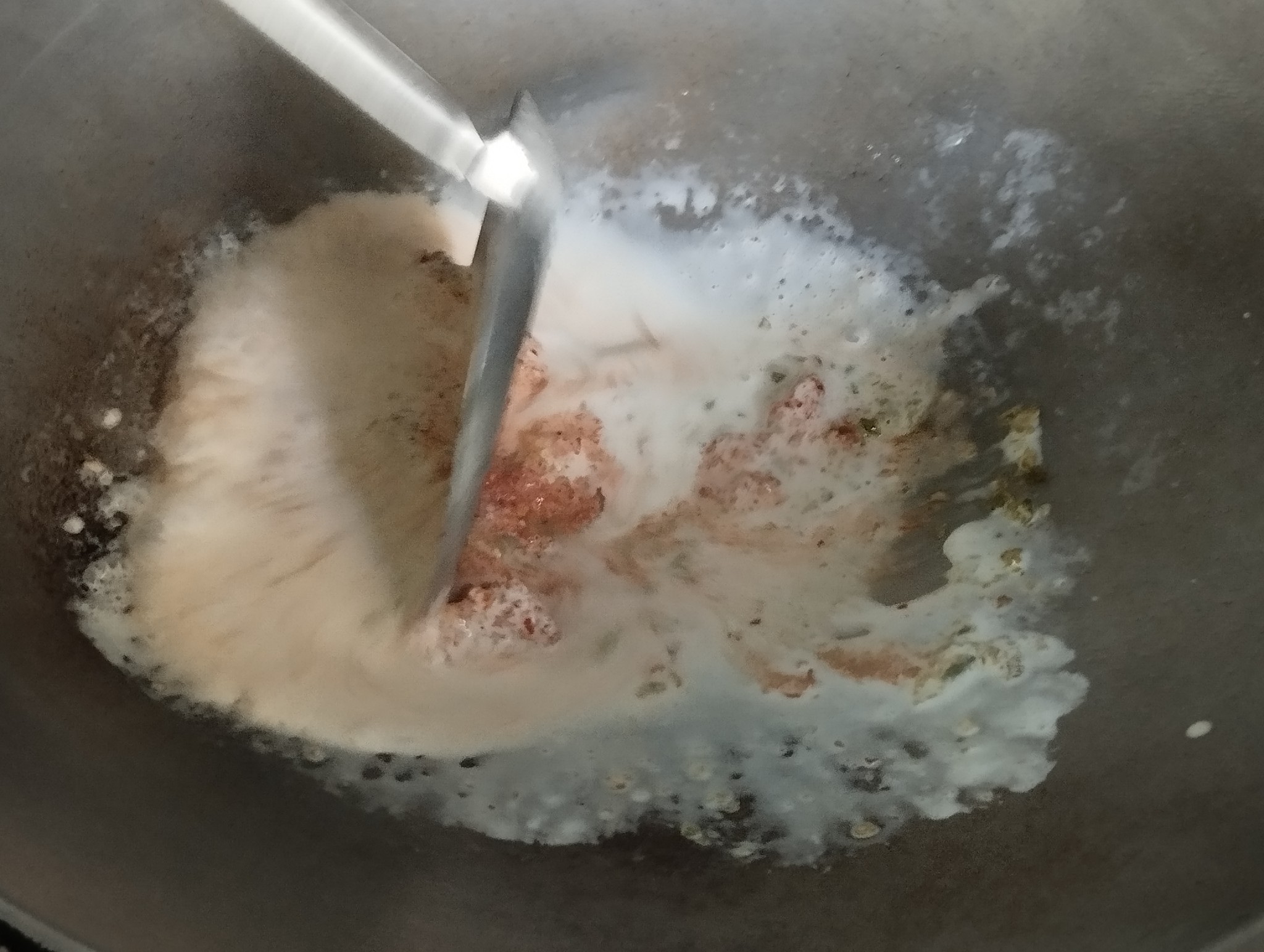 แตกมันแล้วก็เติมหางกะทิหรือกะทิขวดผสมน้ำนั่นแหละ แล้วก็ใช้ไฟอ่อนเหมือนเดิม รอจนแตกมันมาเรื่อย ๆ ค่อยเติมน้ำซุปเพิ่ม ปรุงรสด้วยน้ำตาลมะพร้าวและน้ำปลา