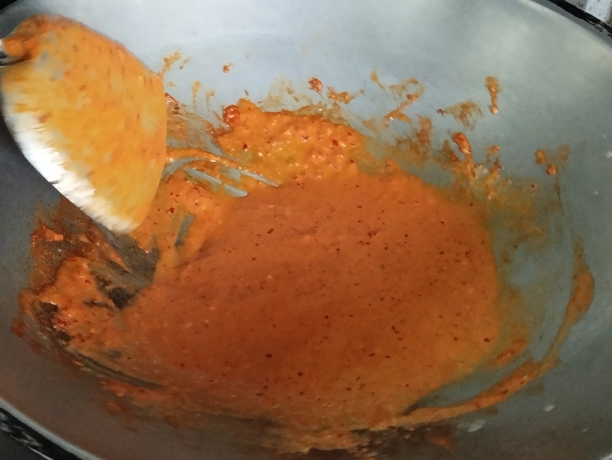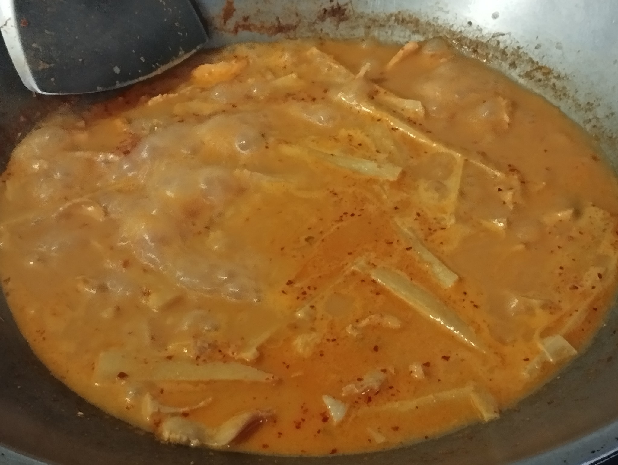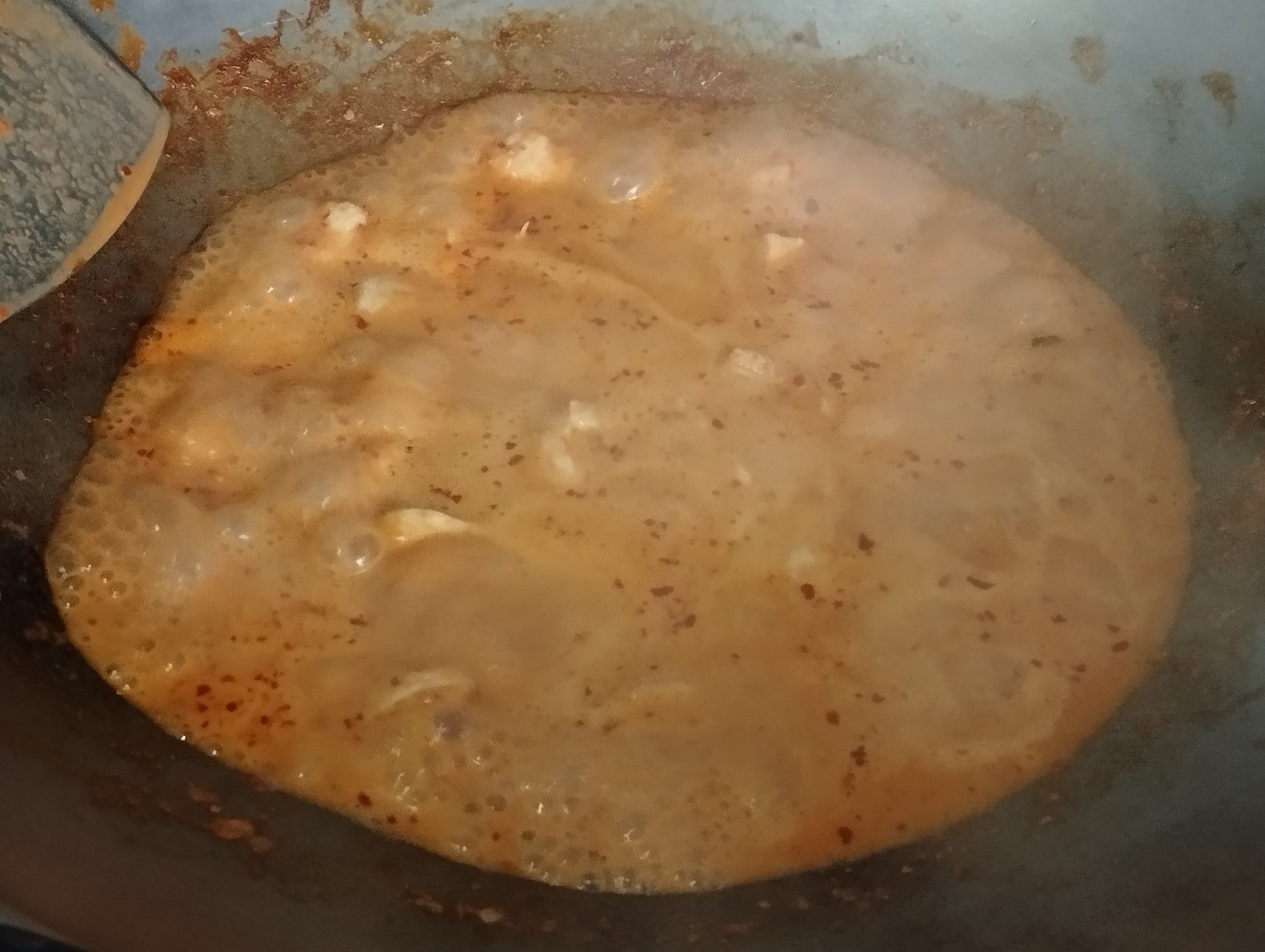 แตกมันแล้วก็เติมหางกะทิหรือกะทิขวดผสมน้ำนั่นแหละ แล้วก็ใช้ไฟอ่อนเหมือนเดิม รอจนแตกมันมาเรื่อย ๆ ค่อยเติมน้ำซุปเพิ่ม ปรุงรสด้วยน้ำตาลมะพร้าวและน้ำปลา