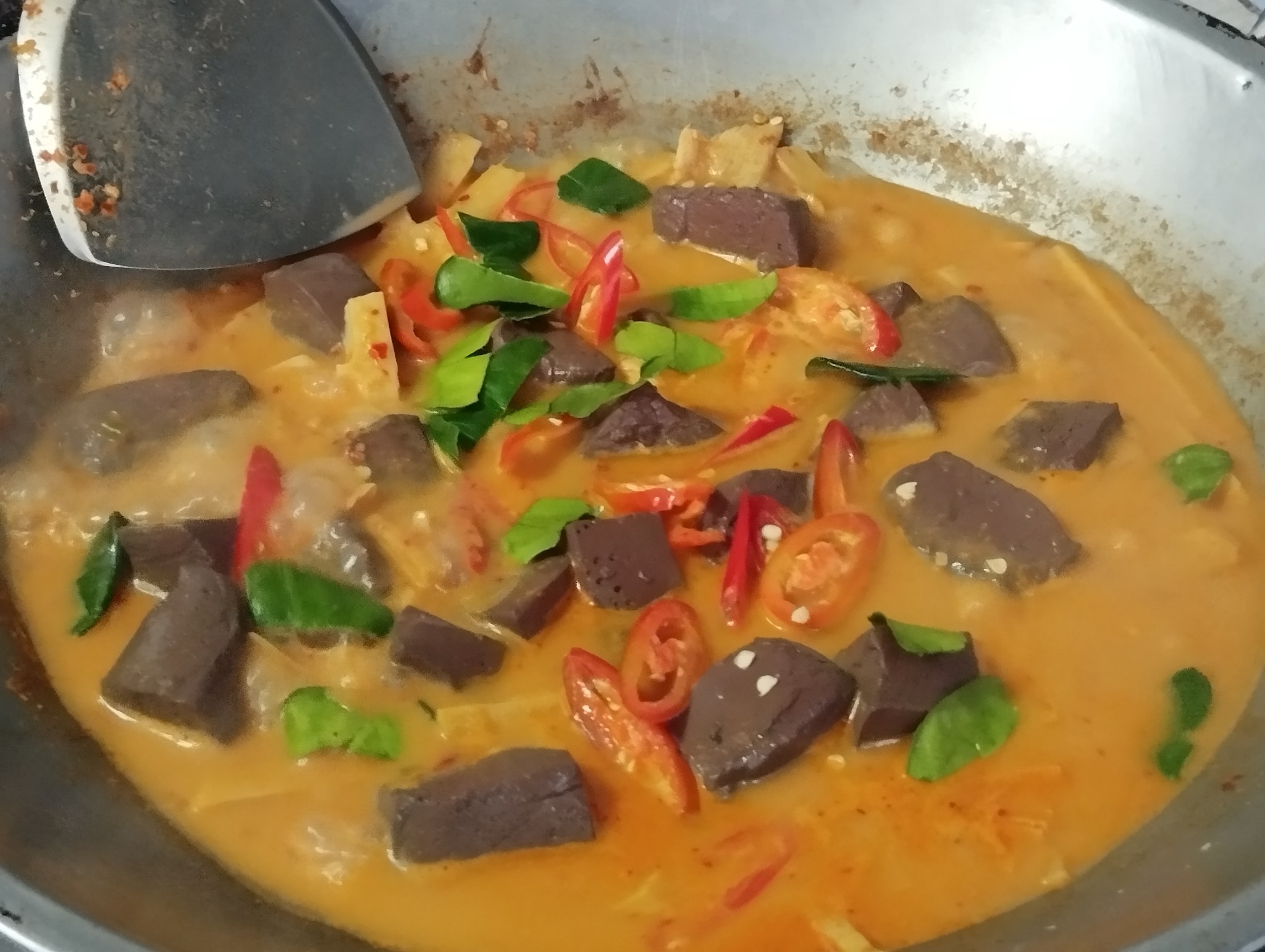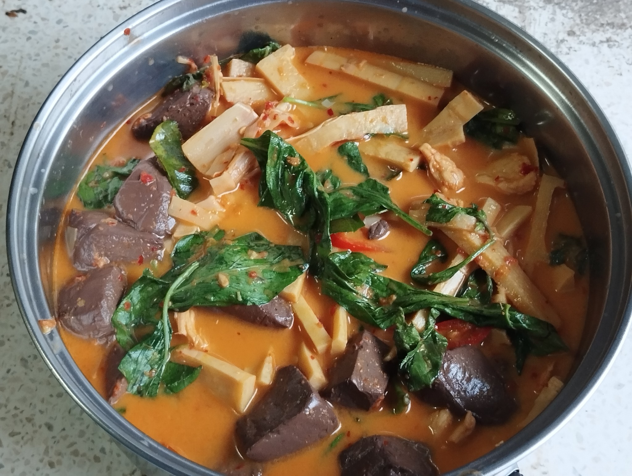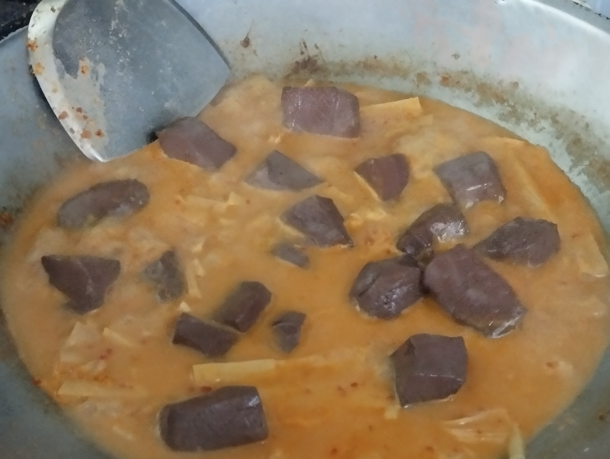 ต้มไปจนคิดว่าหน่อไม้นิ่มพอ หรือไม่ก็ตักมาชิมเอาก็ได้ แล้วค่อยใส่เลือดลงไป