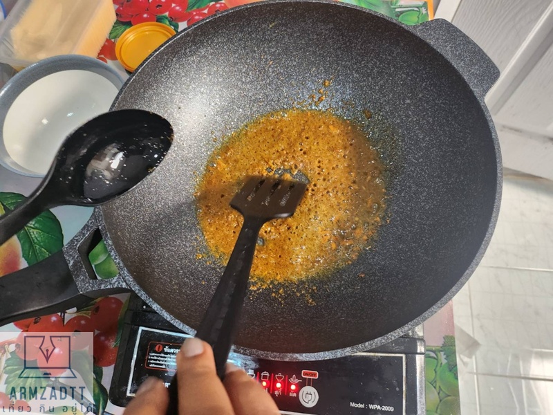 น้ำมันร้อน ใส่เครื่องแกงลงคั่วให้หอม