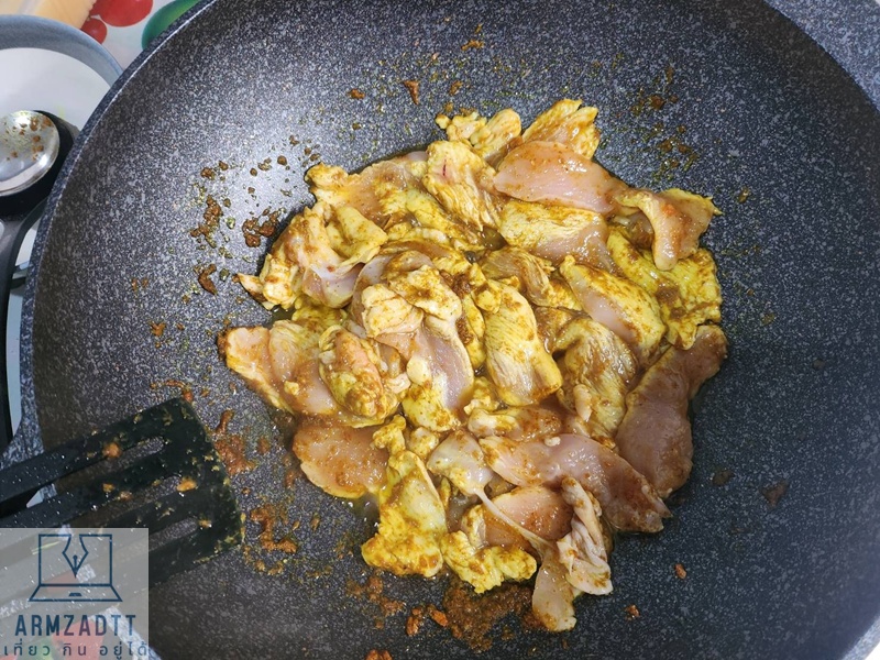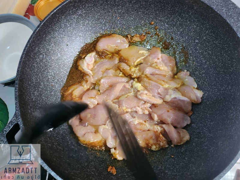 ใส่ไก่ที่หั่นแล้ว ผัดไปมา ให้เนื้อไก่สุด