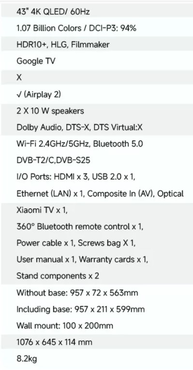 1. Xiaomi A Pro ทีวี 43 นิ้ว QLED 4K Google TV ประกัน3ปี Airplay2/Dolby Audio&&Netflix &Youtube&MEMC 60Hz (ราคา 6439 บาท)