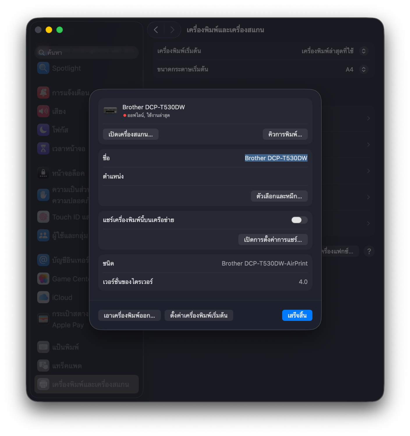 Brother T530W ต่อ AirPrint กับ Macbook MacOS 26.2 ไม่ได้ครับ ปัญหาคือมันจะขึ้นออฟไลน์ตลอดครับ