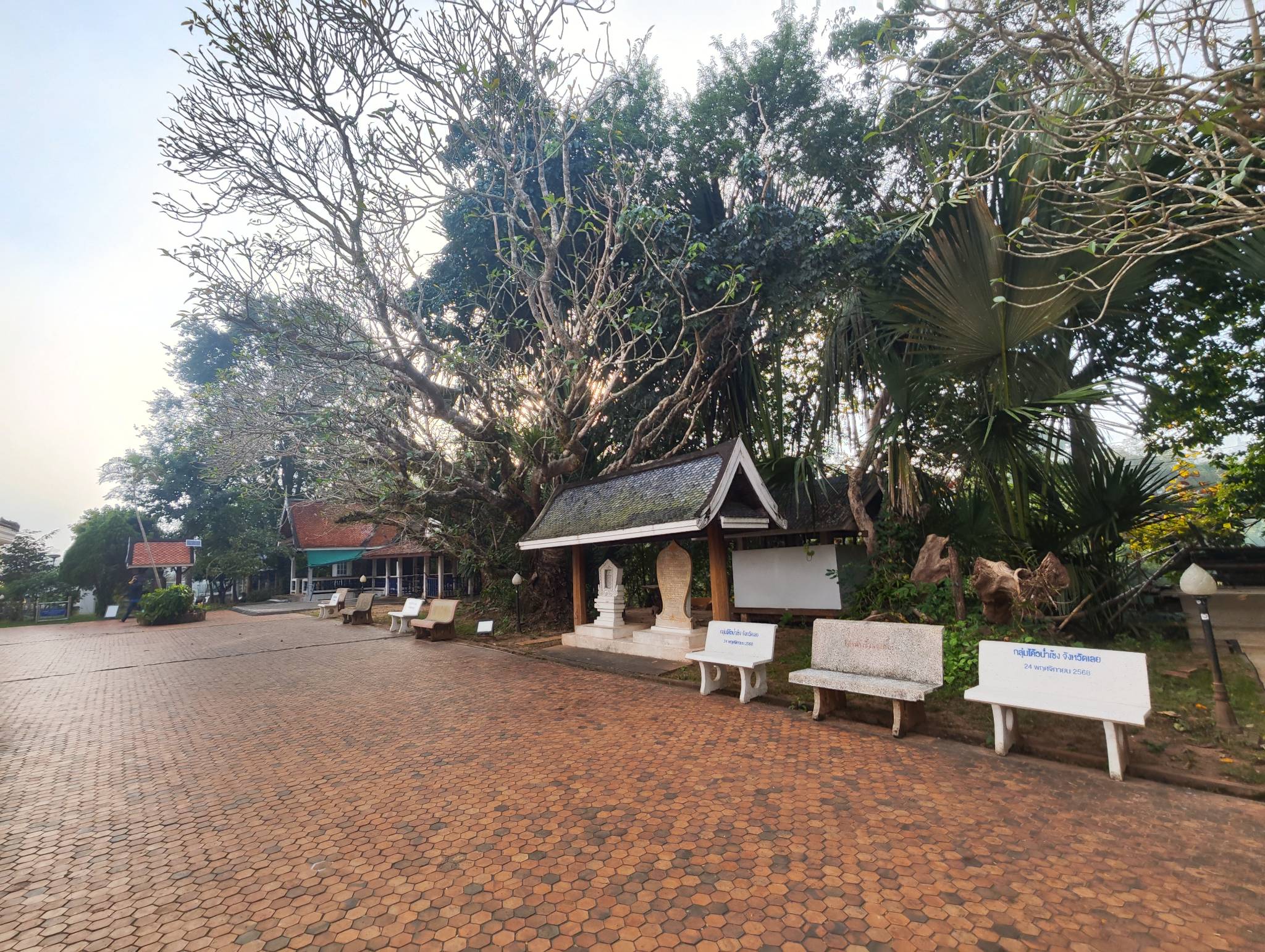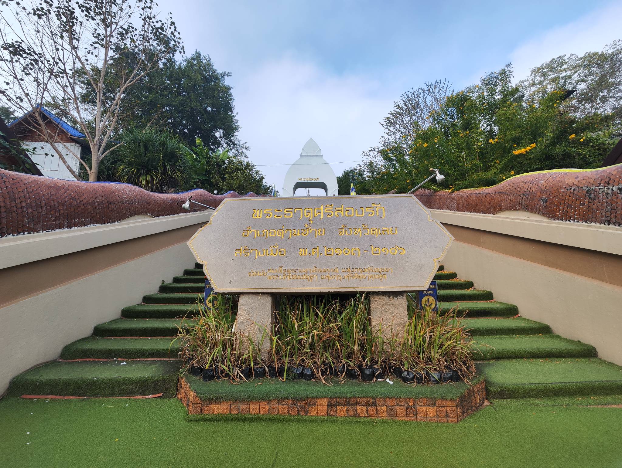 นี่ก็คือพระธาตุศรีสองรักที่เพื่อนแปลกหน้าพูดถึง อันที่จริงเราขับผ่านอยู่นะตอนไปเชียงคาน แต่ไม่รู้ว่าเป็นสถานที่สำคัญ มาครั้งแรกก็งงๆ นิดหน่อย ว่าจะไปทางไหนเพราะมีถนนหลายเส้นเลยด้านใน แต่โชคดีเห็นนักท่องเที่ยวคนอื่นเขาจอดรถกันที่ลานใกล้ๆ ร้านขายของฝาก เราเลยจอดตรงนั้นด้วย