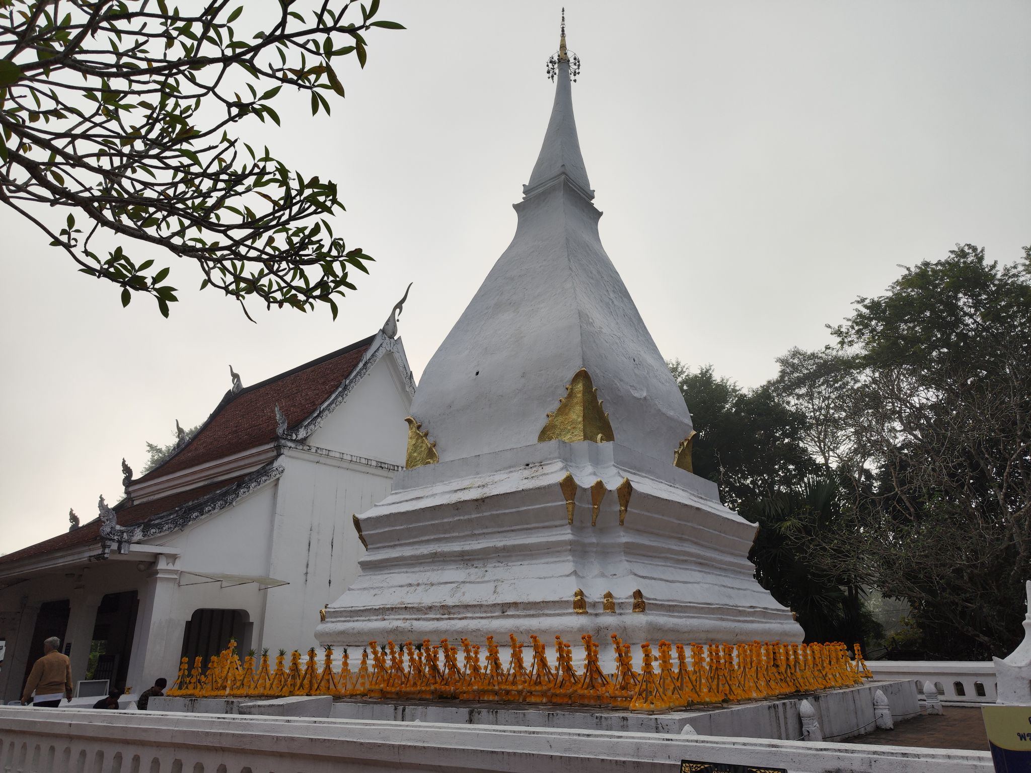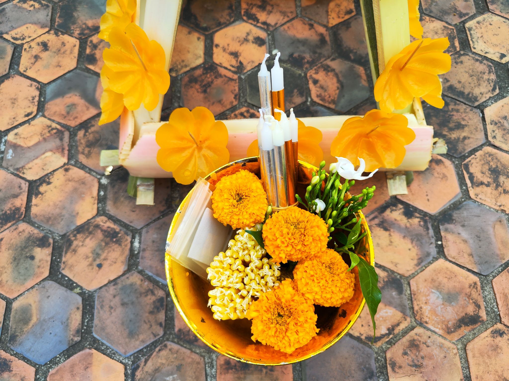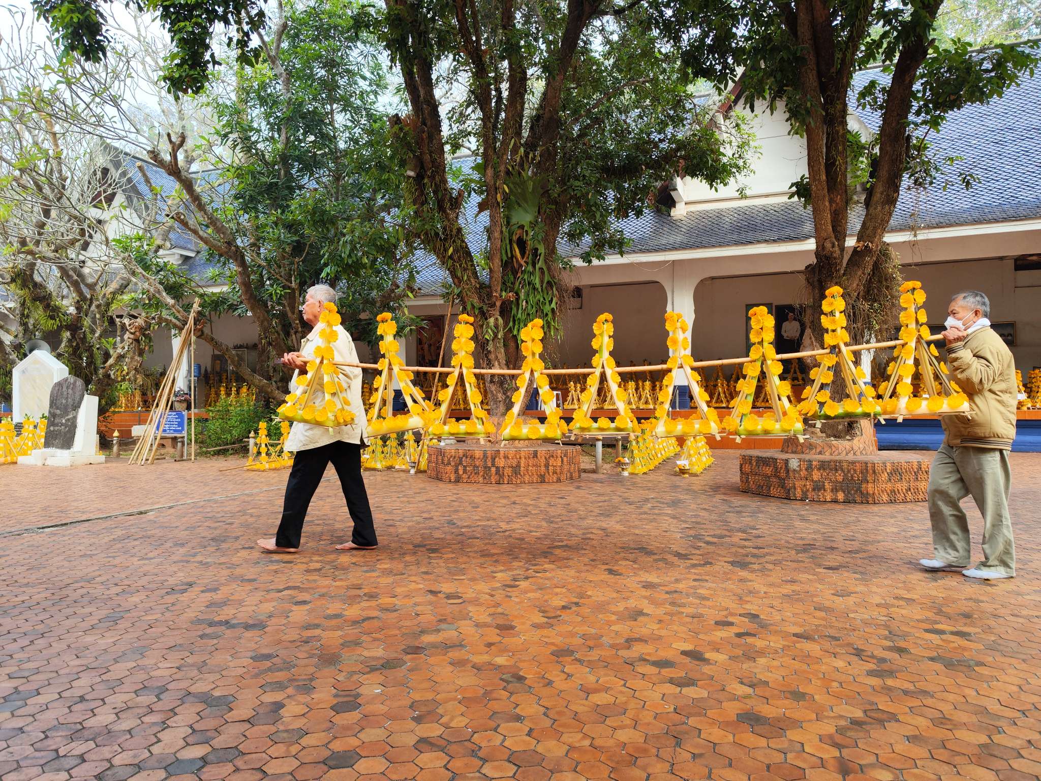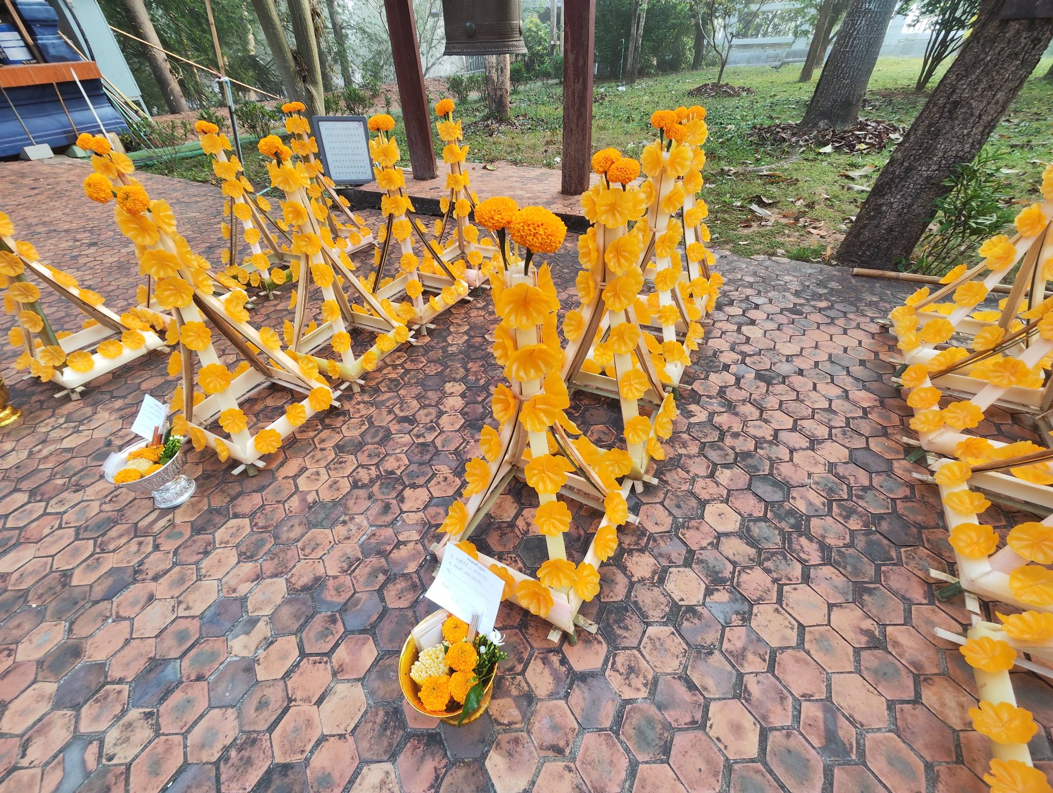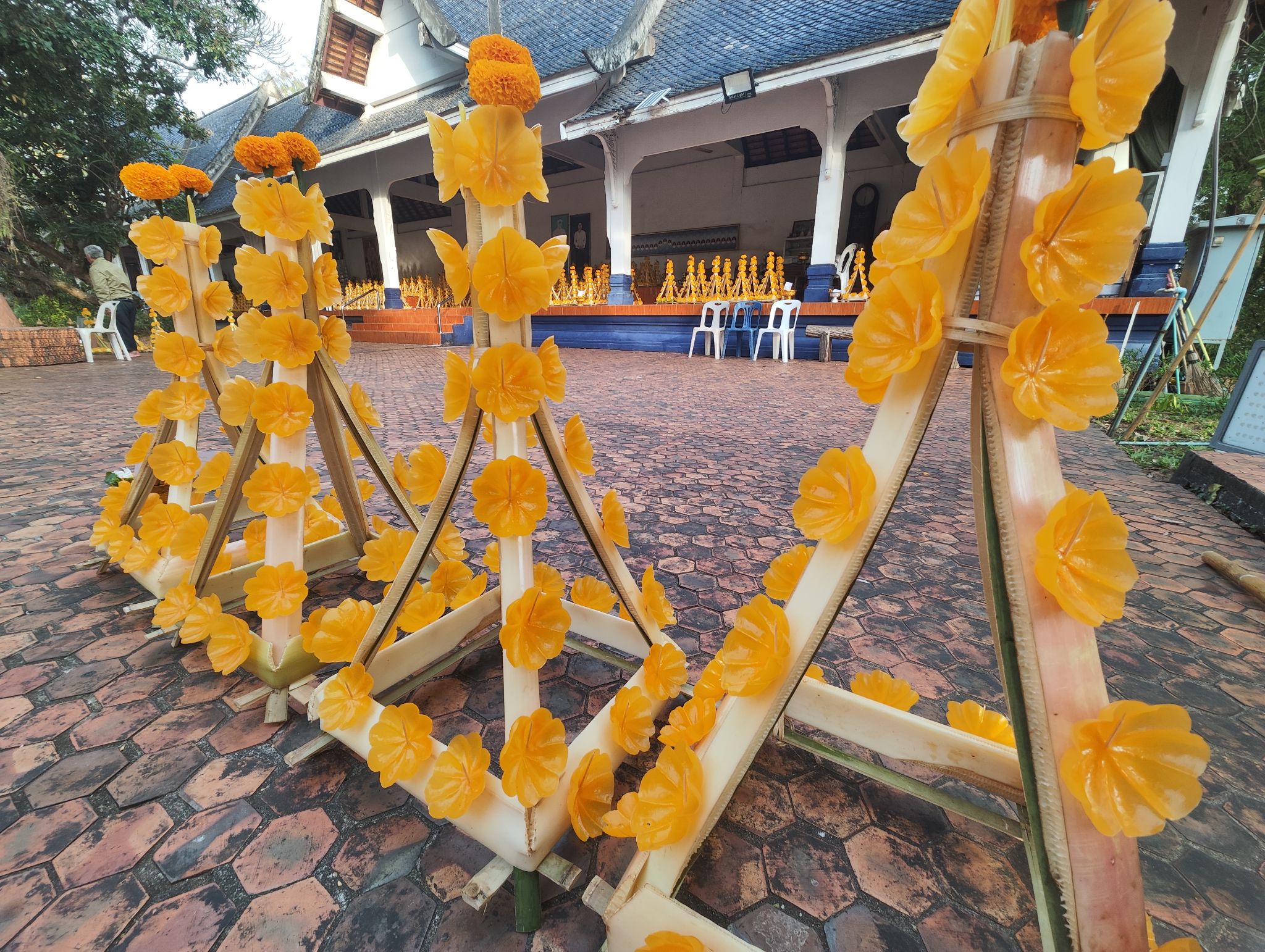 วันที่เราไปเป็นช่วงพ้นปีใหม่ไม่กี่วัน คนมาถวายต้นผึ้งเพื่อความเป็นสิริมงคลขอพรหรือขอบนหรือแก้บนที่พระธาตุศรีสองรักกันเยอะมาก จะเห็นว่าข้างๆ ต้นผึ้งของเราก็มีของคนอื่นเรียงเกือบเต็มพื้นที่ เพื่อรอคิวถวาย อย่างเซตข้างๆ เราถวายเยอะมาก ไม่รู้กี่ต้น แต่มากกว่า 90 ต้นแน่นอน