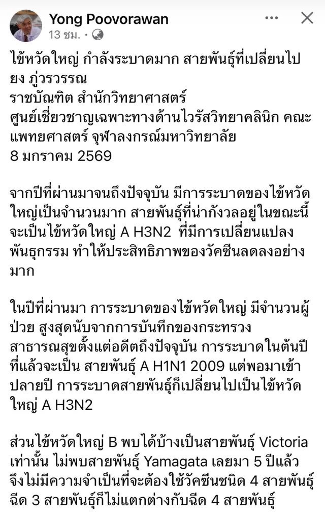 ศ.นพ.ยง ภู่วรวรรณ ราชบัณฑิตด้านไวรัสวิทยาเผย ไข้หวัดใหญ่ A H3N2 สายพันธุ์ใหม่กำลังระบาดรุนแรง มีการเปลี่ยนแปลงพันธุกรรมหลายจุด ส่งผลให้ประสิทธิภาพวัคซีนลดลง แต่ย้ำยังควรฉีดเพื่อลดความรุนแรงของโรค