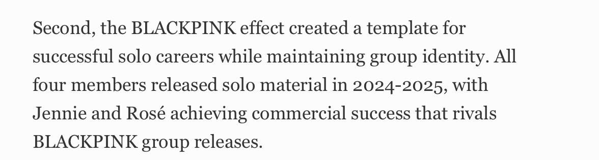 “อิทธิพลของ bp ได้สร้างแม่แบบของการทำงานเดี่ยวที่ประสบความสำเร็จโดยยังคงรักษาอัตลักษณ์ของวงไว้ สมาชิกทั้ง 4 คนต่างปล่อยผลงานเดี่ยวในช่วงปี 2024–2025 ซึ่ง ‘เจนนี่’ และ ‘โรเซ่’ สามารถสร้างความสำเร็จทางตลาดในระดับที่ทัดเทียมกับผลงานในนามวงได้อย่างชัดเจน”