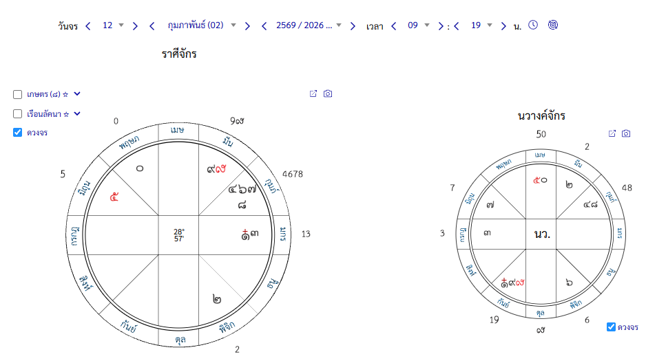 หากดูปฎิทินโหราศาตร์ วันพฤหัสบดีที่ 12 กุมภาพันธ์ พ.ศ.2569 ช่วงเช้าสายๆ ดาวจันทร์(๒)เป็นนิจอ่อนแรงในเรือนมรณะดวงเมือง ในนวางค์จักรอยู่เรือนวินาศน์ ดาวศุกร์(๖)เกาะดาวเสาร์(๗)ในเรือนลาภะ คือความเจ็บปวดรวดร้าว หมดหวัง ในนวางค์จักรศุกร์เป็นนิจในเรือนมรณะ
