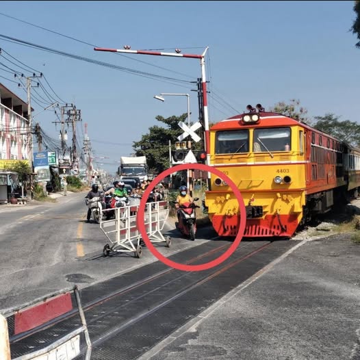 ตัวเองขี่จยย.เกรงใจรถไฟบ้าง รถไฟทั้งใหญ่ทั้งแข็ง ห้ามก็ไม่ฟัง แล้วเป็นไงล่ะ ขาเกือบขาด