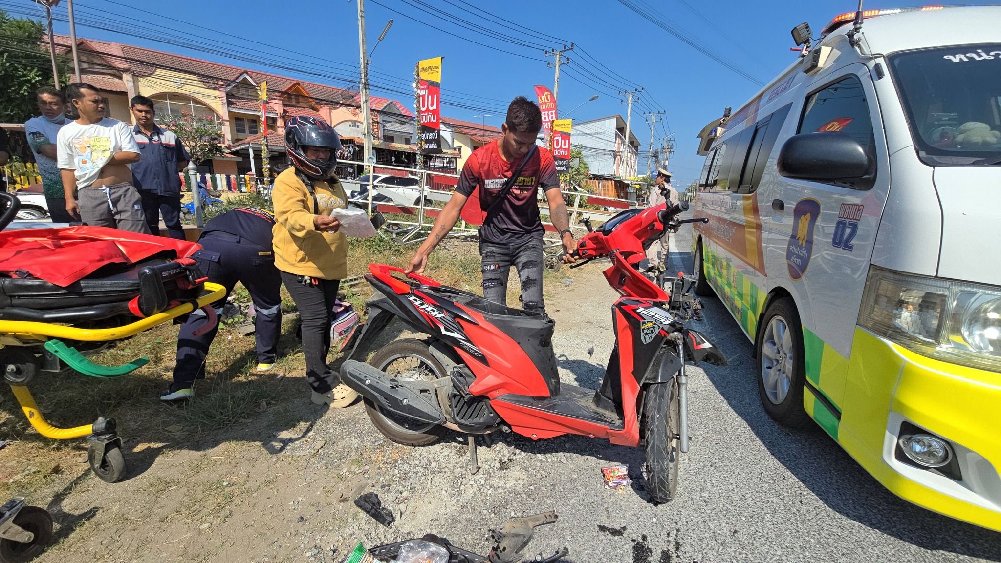 เกิดอุบัติเหตุ คุณตาวัย 64 ปี ขี่รถจักรยานยนต์ฝ่าแผงกั้นทางรถไฟ คันอื่นจอดรออยู่ ห้ามแล้ว แต่ไม่ฟัง ขี่ฝ่าออกไปถูกรถไฟโดยสารพุ่งชน เสียงดังสนั่น จนร่างกระเด็นนอนร้องครวญคราง พบขาซ้ายเกือบขาดออกจากกัน ตามร่างกายมีรอยถลอก กู้ชีพกู้ภัยนำส่งโรงพยาบาล