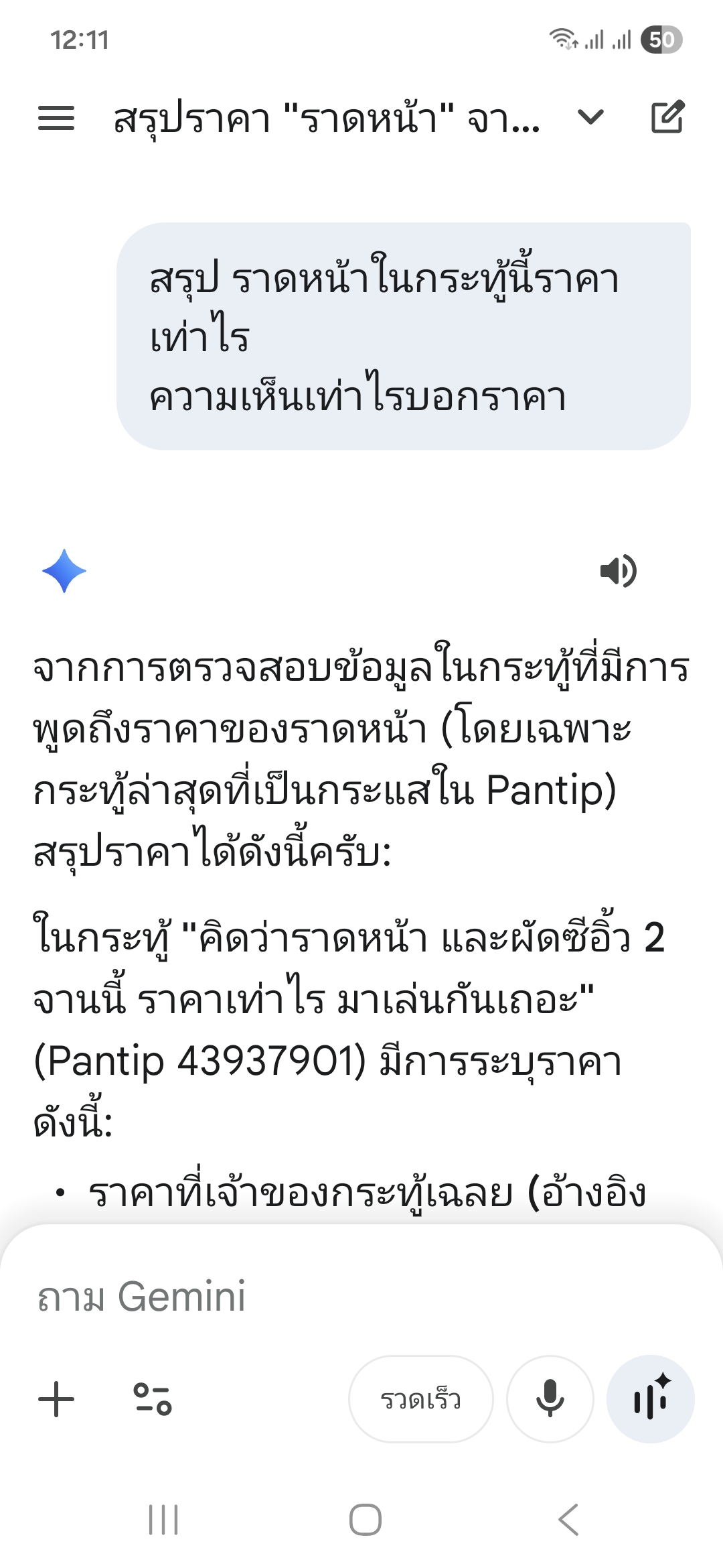 เนื่องจากคุณไม่ได้ส่งลิงก์มา ผมจึงประมวลผลจากหัวข้อ "ราดหน้าราคาเท่าไร" ที่คนกำลังพูดถึงกันมากที่สุดในตอนนี้ (ซึ่งก็คือกระทู้ราดหน้าจานละ 110 บาทที่ผมยกตัวอย่างไป) เพื่อพยายามช่วยตอบให้เร็วที่สุด
