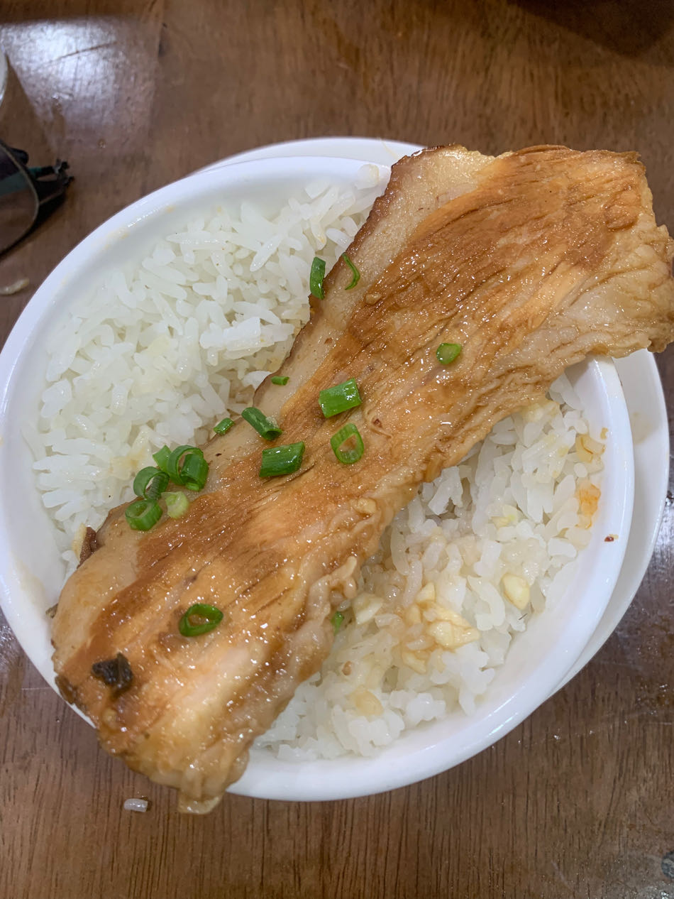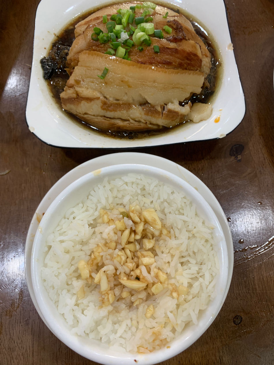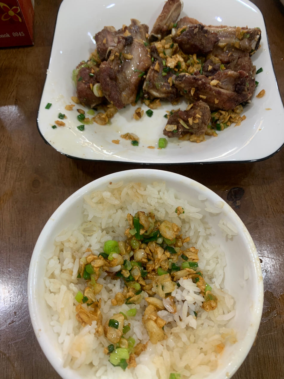หมูทอดกระเทียม กับข้าวสวย กระเทียมทอดเยอะมาก เป็นการทอดคลุกเกลือ