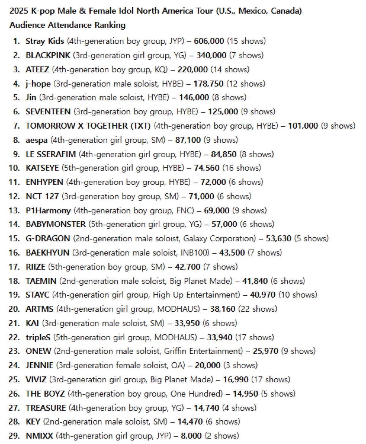 ✨ อันดับผู้เข้าชมคอนเสิร์ตไอดอล K-pop (ชายและหญิง) ประจำปี 2025 ในทัวร์อเมริกาเหนือ (สหรัฐอเมริกา เม็กซิโก แคนาดา)