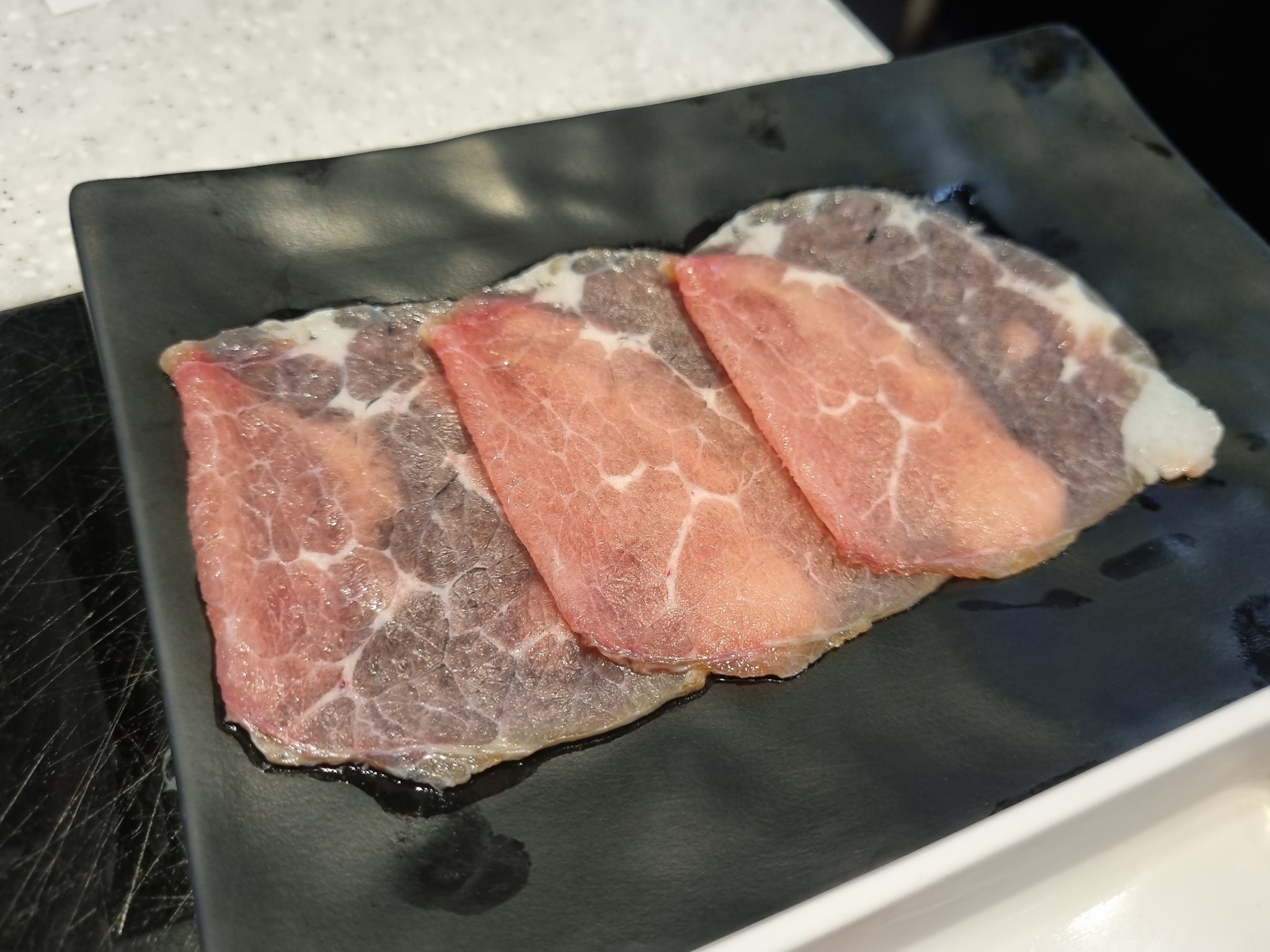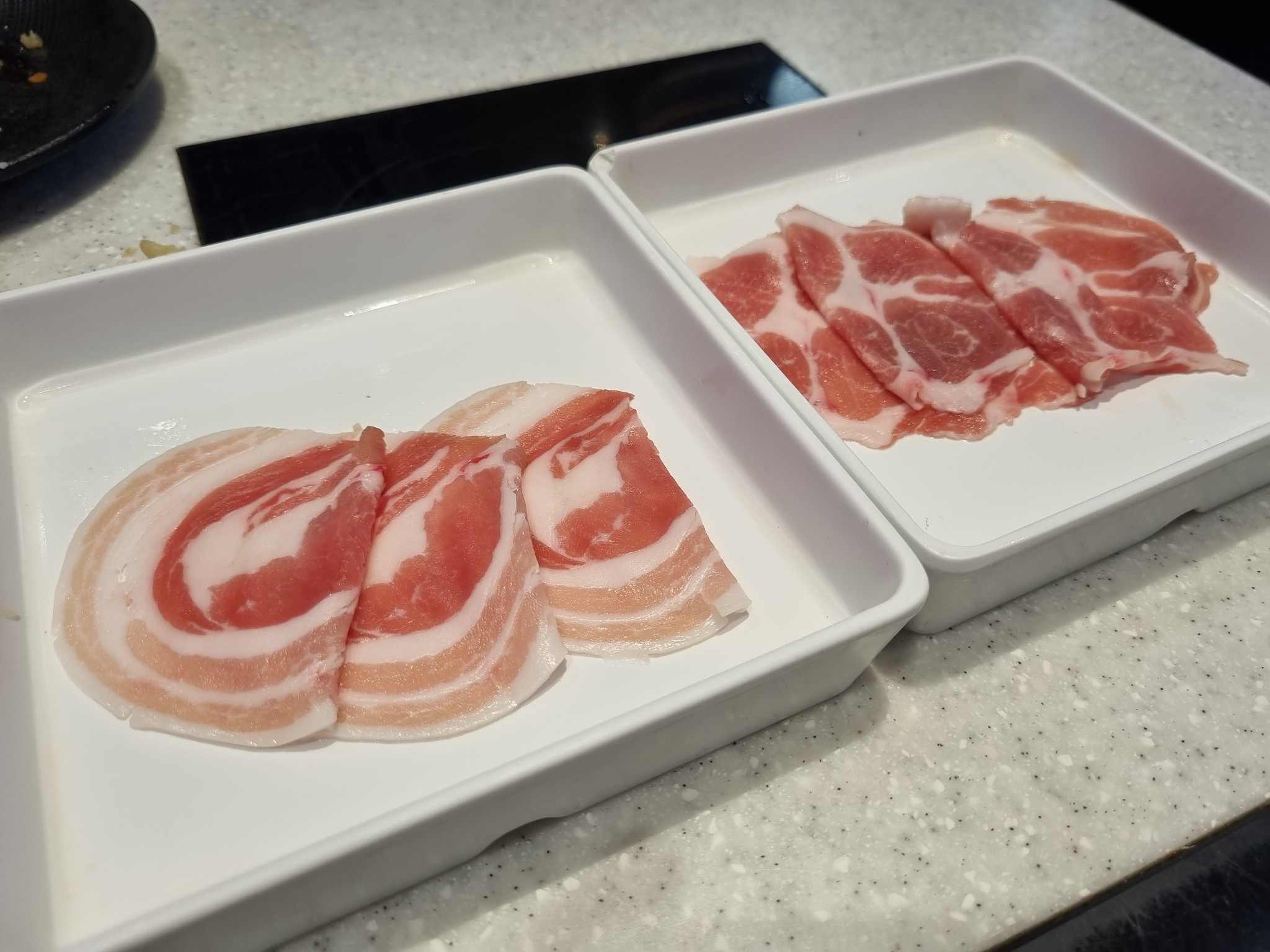 สามชั้นกับสันคอหมู ซึ่งผลอกมาคือ เนื้อต้มหอมอร่อยสุดๆ ทั้งความมันและความนุ่ม เอาลงไปจุ่มเวียนกันสี่ซุป ก็ได้รสชาติที่แปลกใหม่ไม่ซ้ำกันเลย