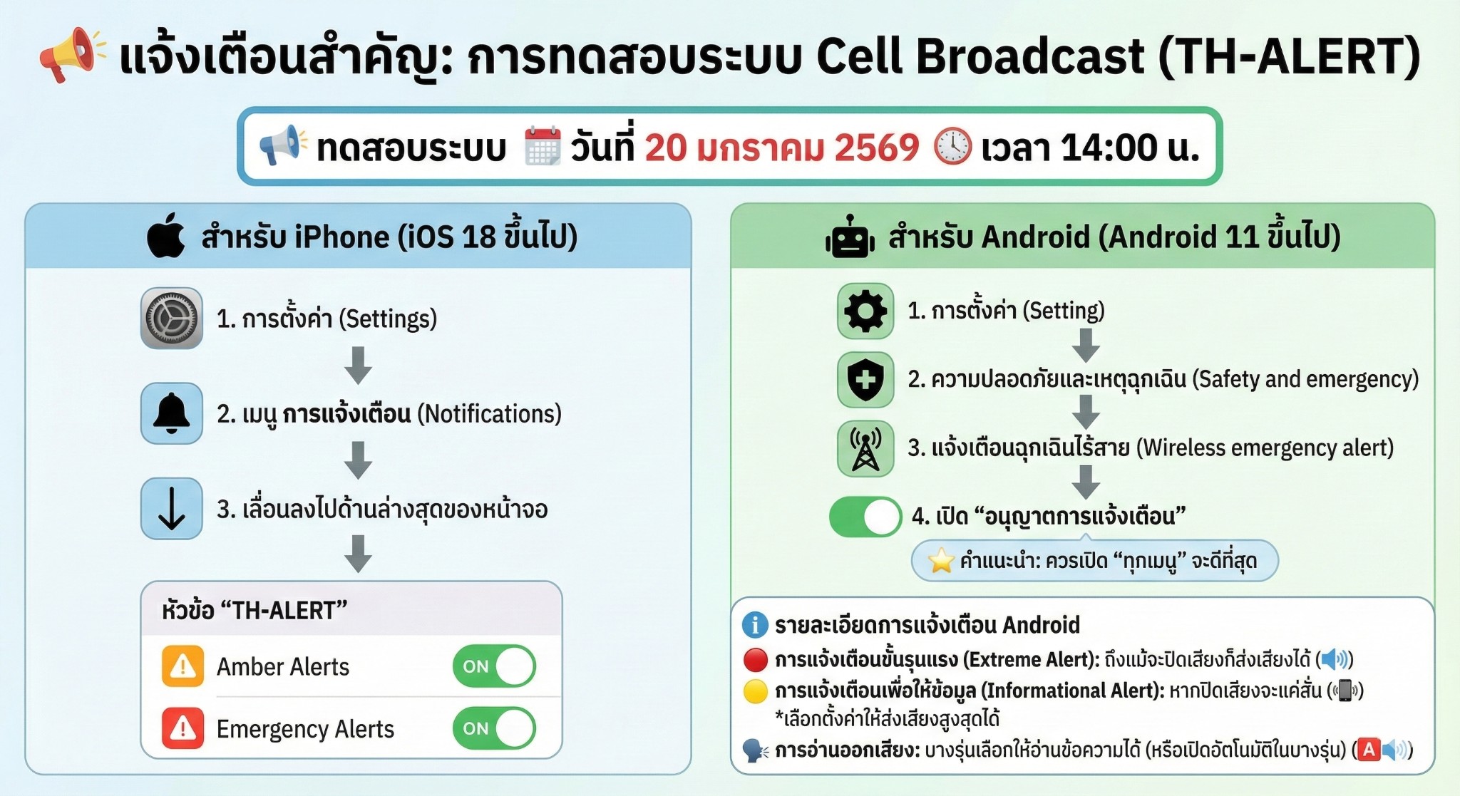 เพื่อให้มั่นใจว่ามือถือของท่านจะสามารถรับการแจ้งเตือนที่สำคัญในอนาคตได้ (เผื่อมีเหตุฉุกเฉินจริง) ทางหน่วยงานที่เกี่ยวข้องได้จัดทำวิธีตรวจสอบและเปิดการตั้งค่าสำหรับทั้ง iPhone และ Android มาให้แล้ว ดูตามภาพด้านล่างนี้ได้เลยครับ เข้าใจง่ายมากๆ