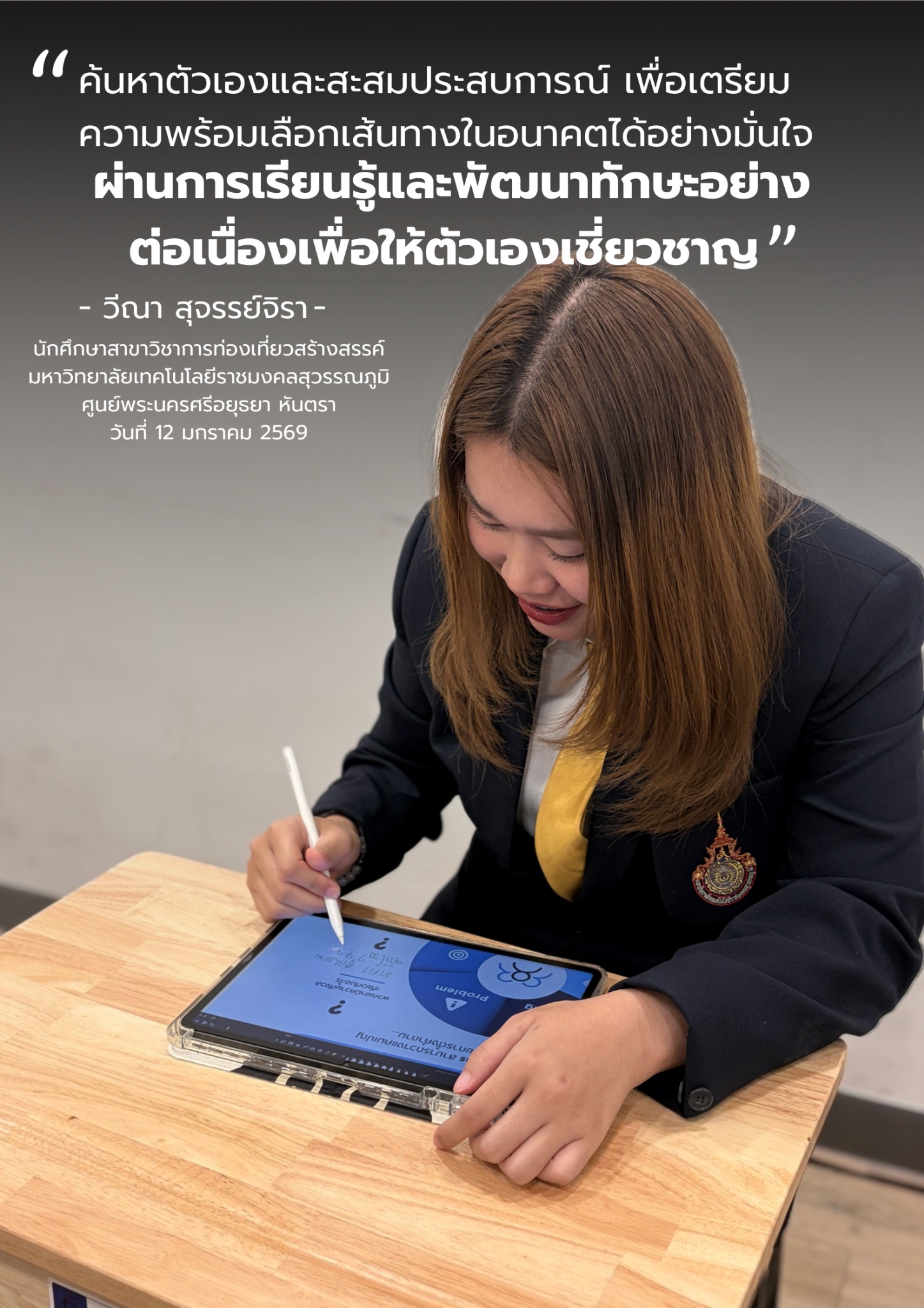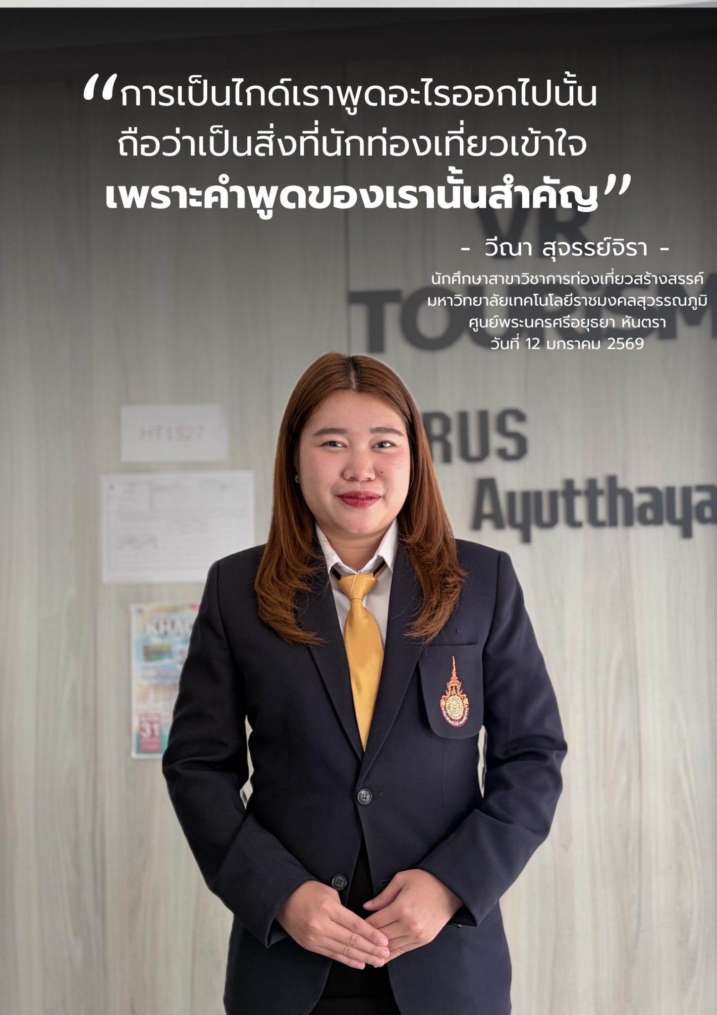 จากการสัมภาษณ์ของพี่วีณาหนึ่งในนักศึกษาตัวแทนในวันนี้ จะเห็นได้ว่า สาขาวิชาการท่องเที่ยวสร้างสรรค์ คณะศิลปศาสตร์ มหาวิทยาลัยเทคโนโลยีราชมงคลสุวรรณภูมิ ศูนย์พระนครศรีอยุธยา หันตรา ไม่ได้มอบเพียงความรู้ด้านการท่องเที่ยวเท่านั้น แต่ยังเป็นพื้นที่แห่งการเรียนรู้ลงพื้นที่จริง การเติบโต และการค้นหาตัวตนของนักศึกษาอย่างแท้จริง ทั้งในด้านทักษะวิชาชีพ ความรับผิดชอบ วินัย และทัศนคติในการใช้ชีวิต ประสบการณ์ของพี่วีณาสะท้อนให้เห็นว่า แม้เส้นทางการเรียนจะมีอุปสรรค ความท้อ และความกดดัน แต่ด้วยแรงผลักดันจากครอบครัว อาจารย์ และสภาพแวดล้อมที่เอื้อให้เกิดการเรียนรู้ ทำให้พี่วีณาสามารถก้าวข้ามความยากลำบากและพัฒนาตนเองได้อย่างต่อเนื่อง หวังว่าการสัมภาษณ์ครั้งนี้จะช่วยให้น้อง ๆ ที่กำลังมองหามหาวิทยาลัยและสาขาที่เหมาะสม ได้เห็นภาพของการเรียนสาขาวิชาการท่องเที่ยวสร้างสรรค์อย่างชัดเจนมากยิ่งขึ้น และนำแรงบันดาลใจจากเรื่องราวเหล่านี้ไปใช้ในการตัดสินใจเลือกเส้นทางการศึกษา เพื่อก้าวสู่อนาคตที่มั่นคงและภาคภูมิใจในตัวเอง