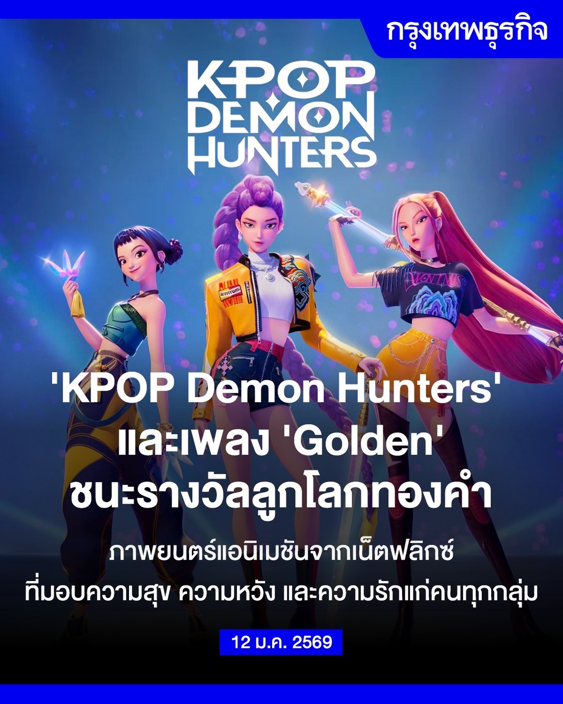 KPOP Demon Hunters แอนิเมชันสุดฮิตจากเน็ตฟลิกซ์ (Netflix) ได้รางวัล ลูกโลกทองคำ (Golden Globe) สาขา ภาพยนตร์แอนิเมชันยอดเยี่ยม และเพลงฮิตติดหูอย่างเพลง Golden ของภาพยนตร์เรื่องนี้ ก็ได้รับรางวัลลูกโลกทองคำ สาขา เพลงประกอบภาพยนตร์ยอดเยี่ยม