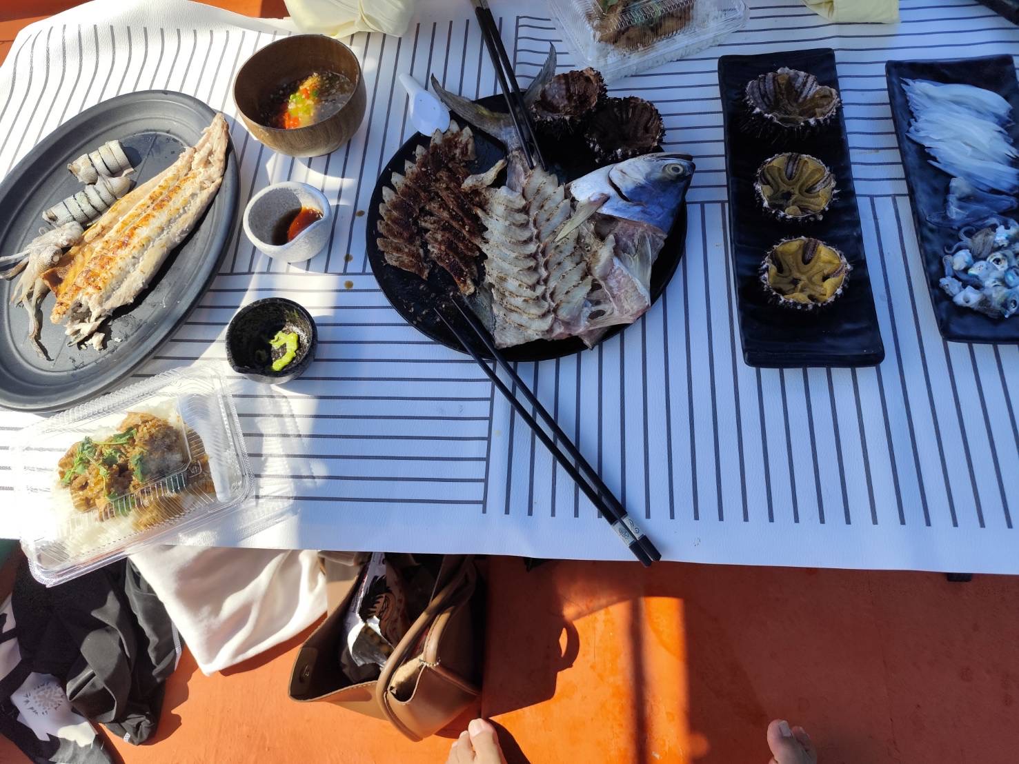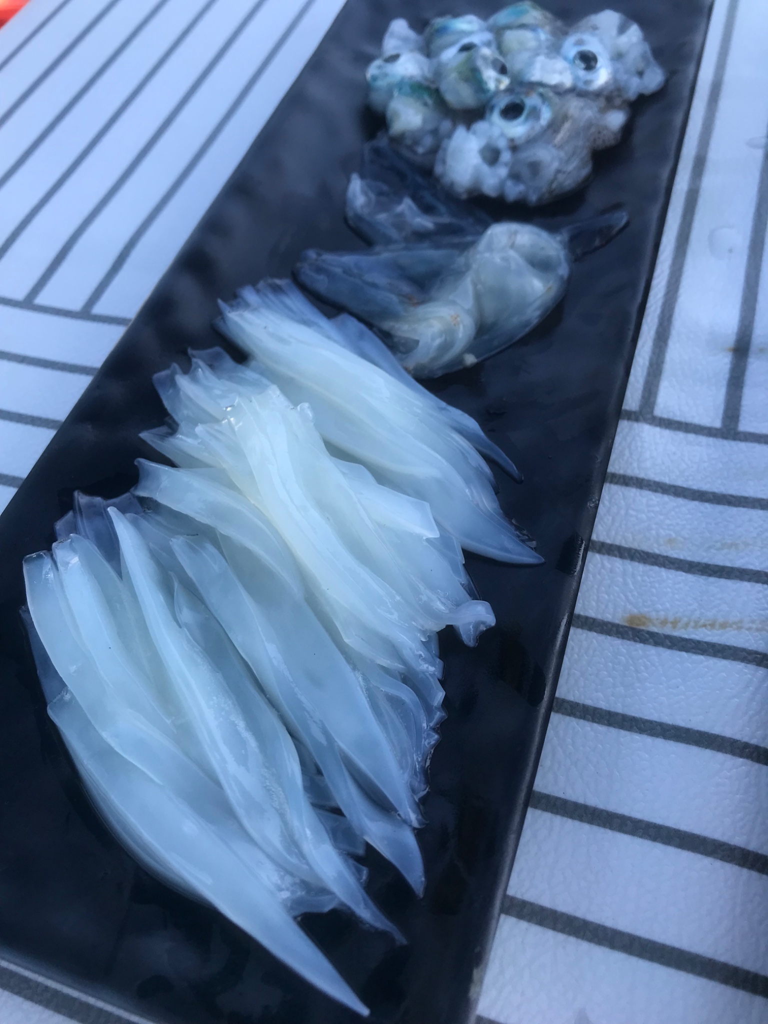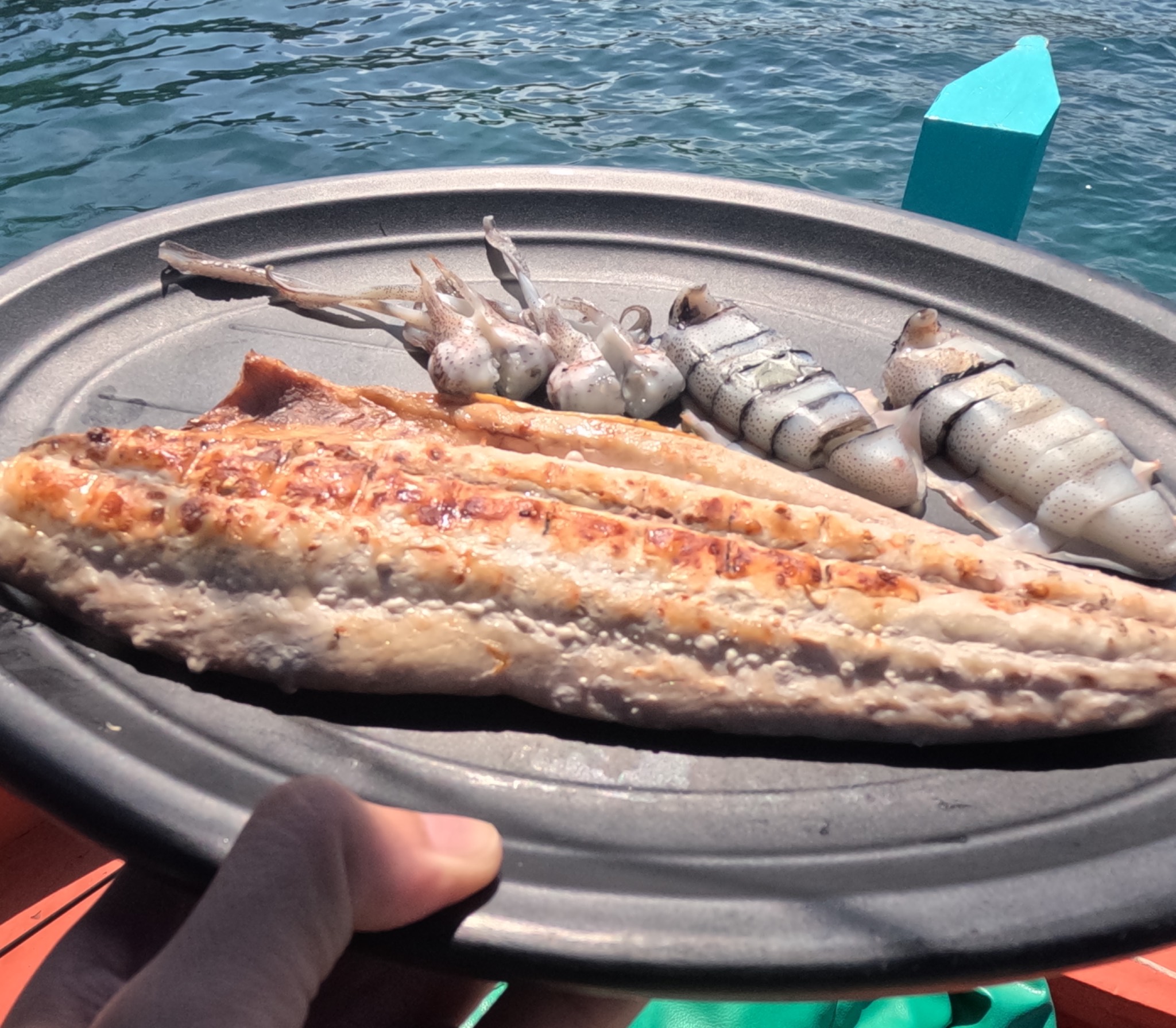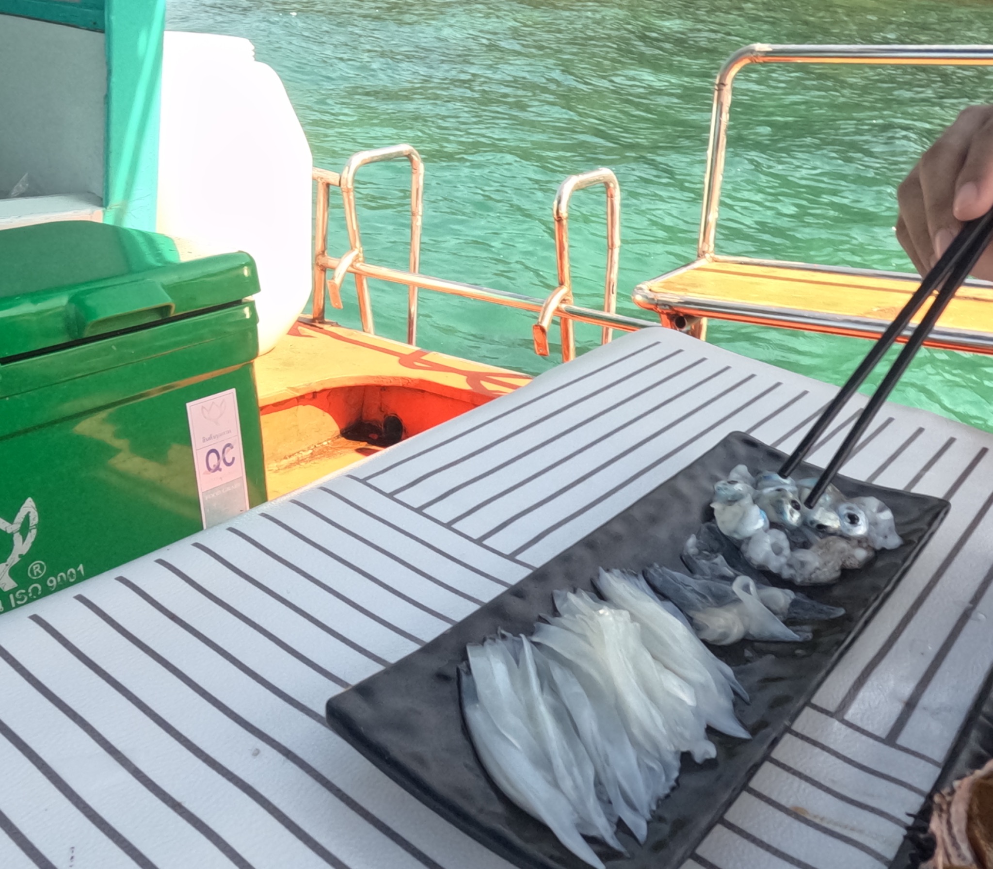 วันที่ 2 เราเช่าเรือออกไปตกหมึก ดำน้ำกัน จองกับเพจ ดำน้ำตกหมึกสองพี่น้อง ราคา 2,200฿ ได้กินหมึกสดๆ ปลาสดๆ ซาชิมิ ดำน้ำ มีข้าวกล่องให้ 1 มื้อ