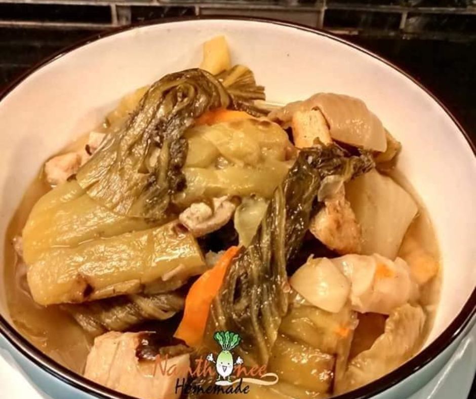 - นำผักกาดดองลงผัดในกระทะพอให้ผักอ่อนตัวจากนั้นใส่ลงในหม้อเช่นเดียวกัน