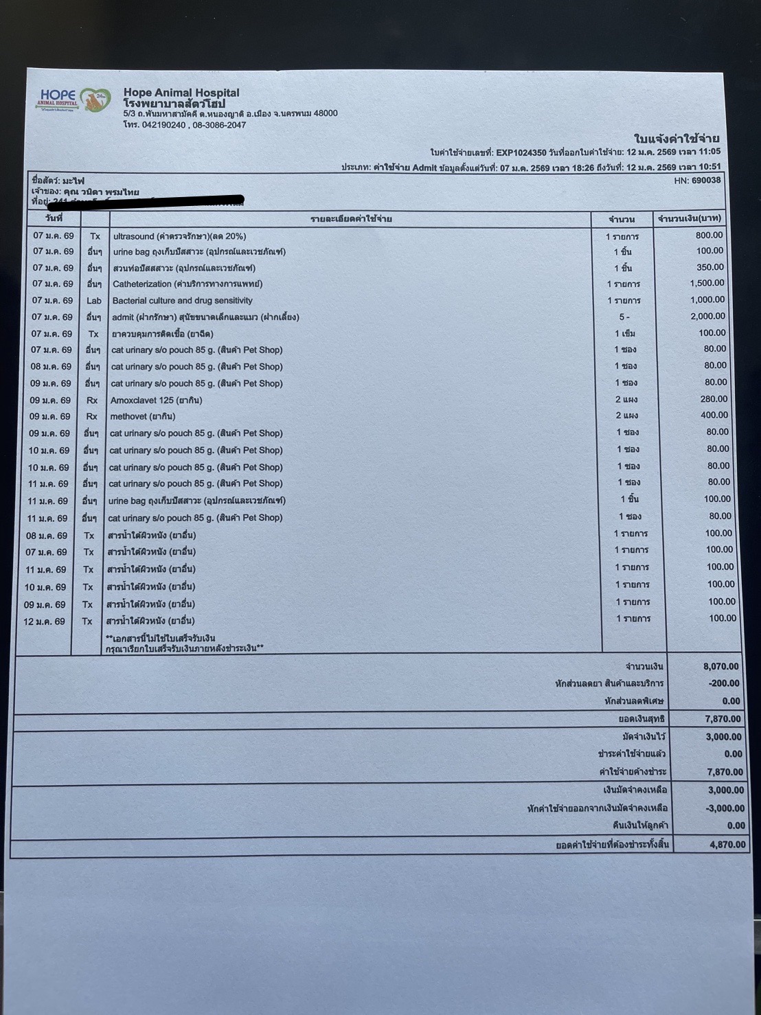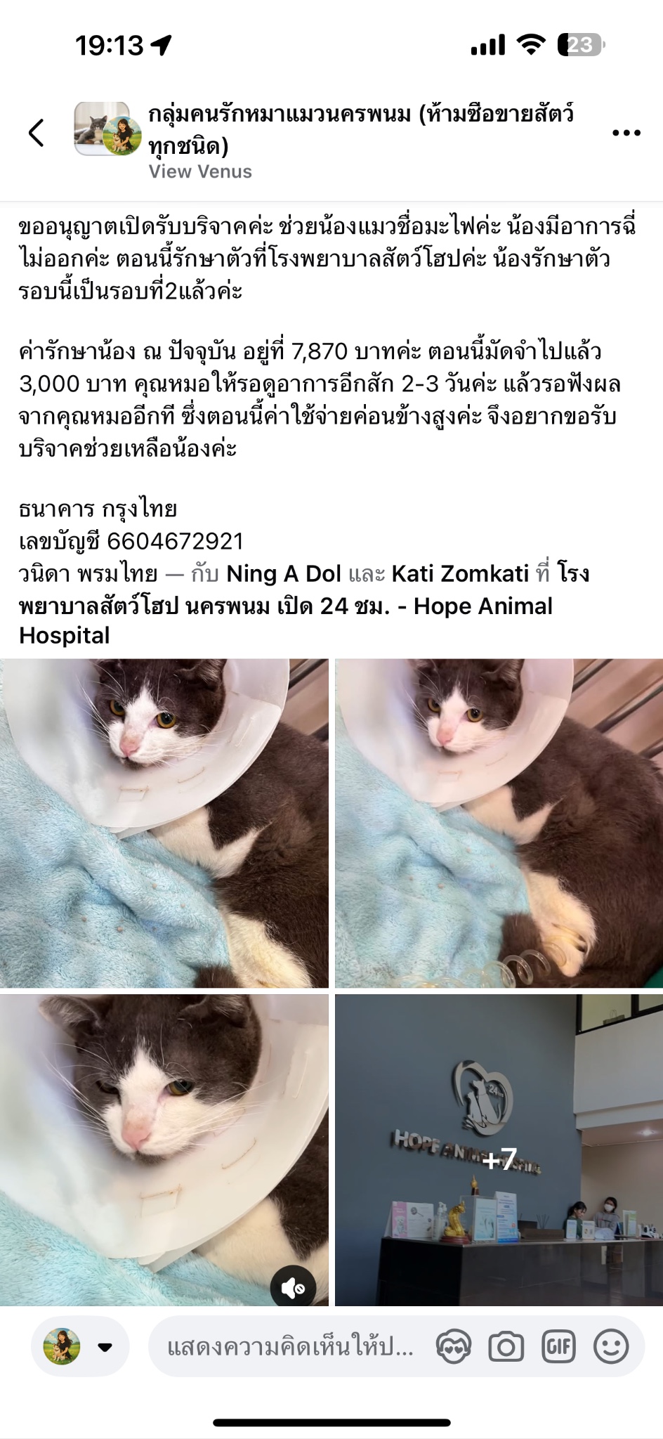 ขออนุญาตเปิดรับบริจาคค่ะ ช่วยน้องแมวชื่อมะไฟค่ะ น้องมีอาการฉี่ไม่ออกค่ะ ตอนนี้รักษาตัวที่โรงพยาบาลสัตว์โฮปค่ะ น้องรักษาตัวรอบนี้เป็นรอบที่2แล้วค่ะ