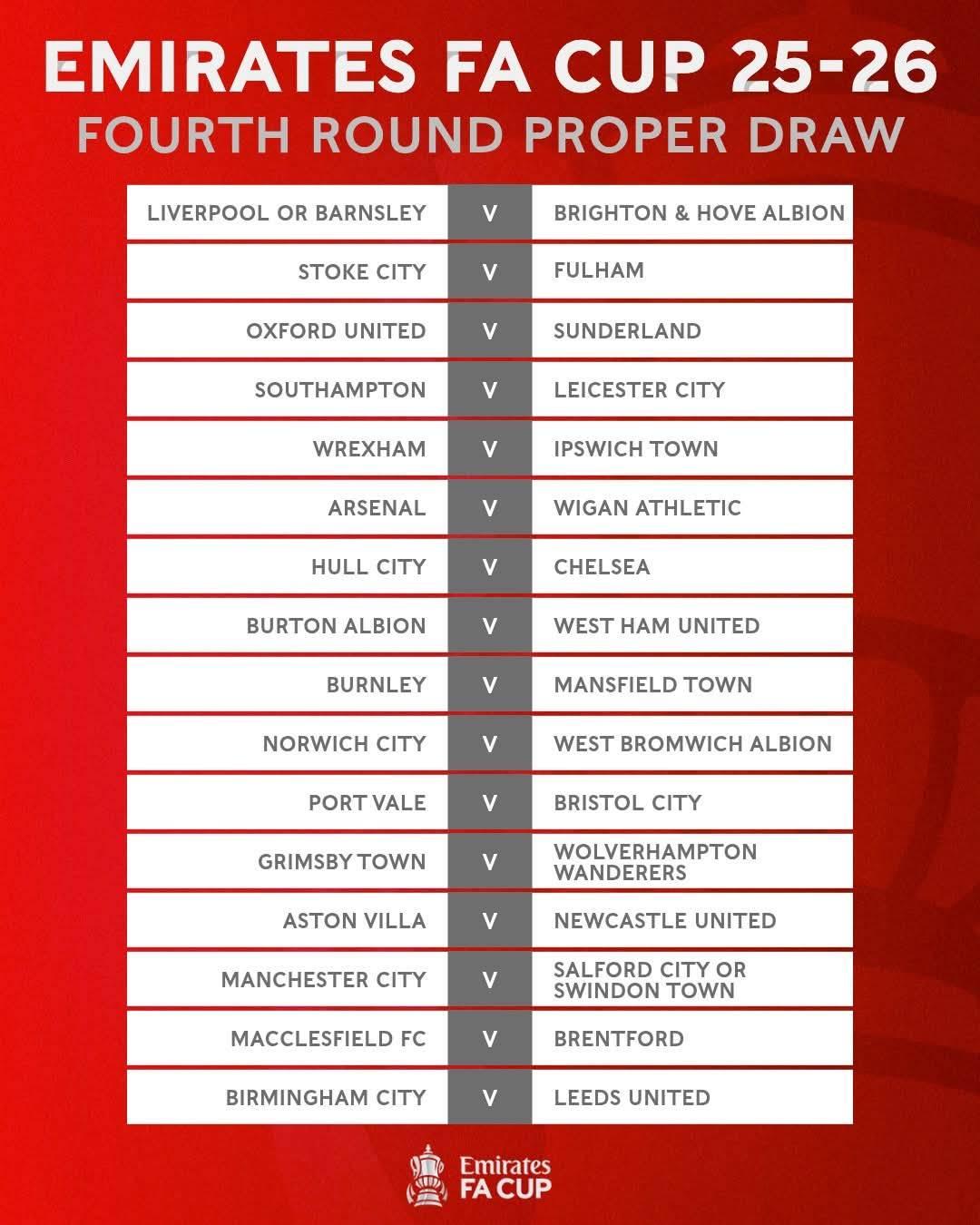 ฟุตบอลเอฟเอ คัพ รอบสี่ จับสลากตั้งแต่ก่อนเริ่มคู่ระหว่างลิเวอร์พูลกับบาร์นสลีย์ ผลออกมาเป็นดังนี้