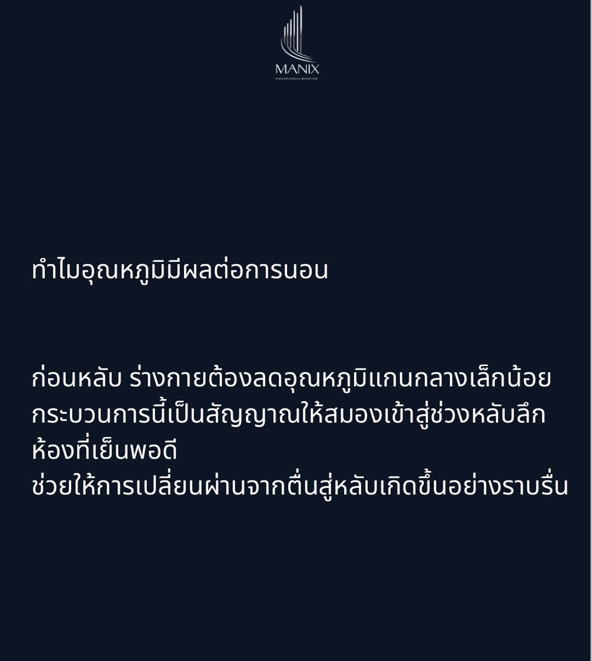 • กลไกร่างกาย: ก่อนนอนสมองจะกระตุ้นให้อุณหภูมิแกนกลางลดลงเล็กน้อยเพื่อเป็นสัญญาณเข้าสู่วงจรการนอน