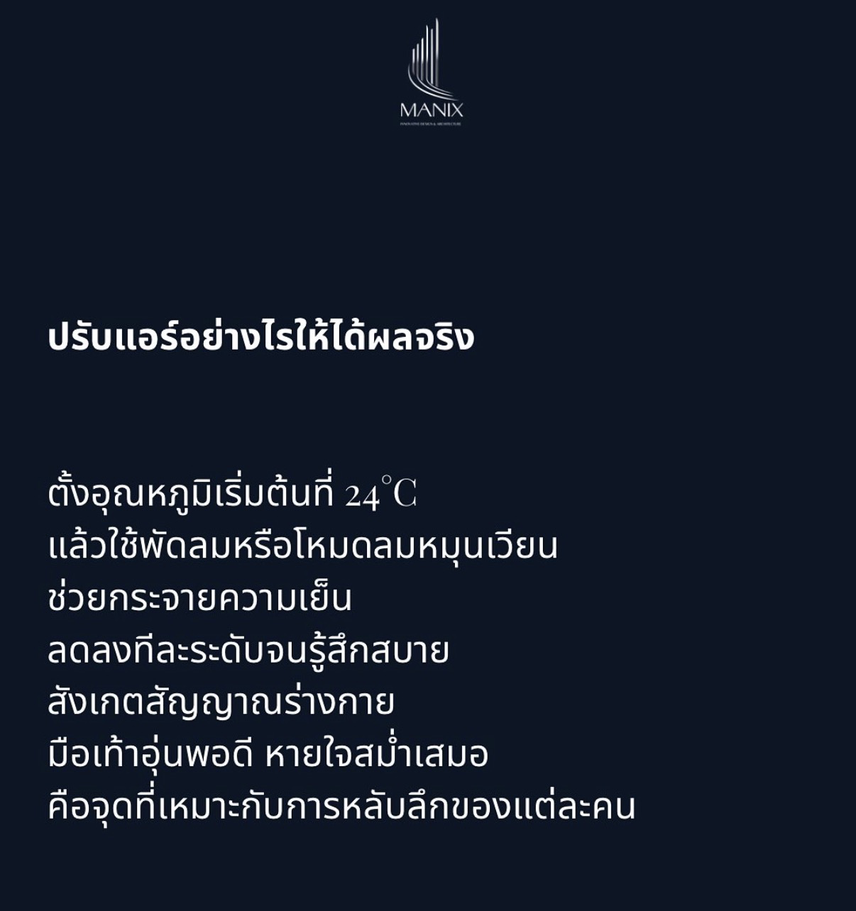 • ควรเริ่มต้นตั้งอุณหภูมิที่ 24°C แล้วใช้พัดลมช่วยกระจายความเย็น