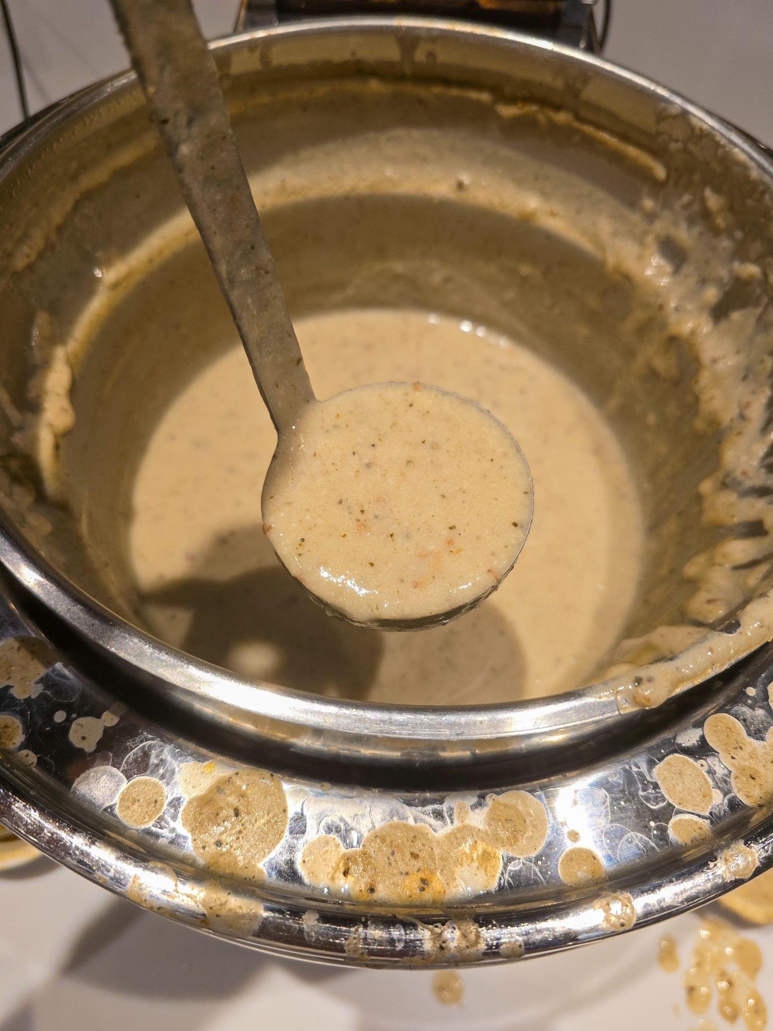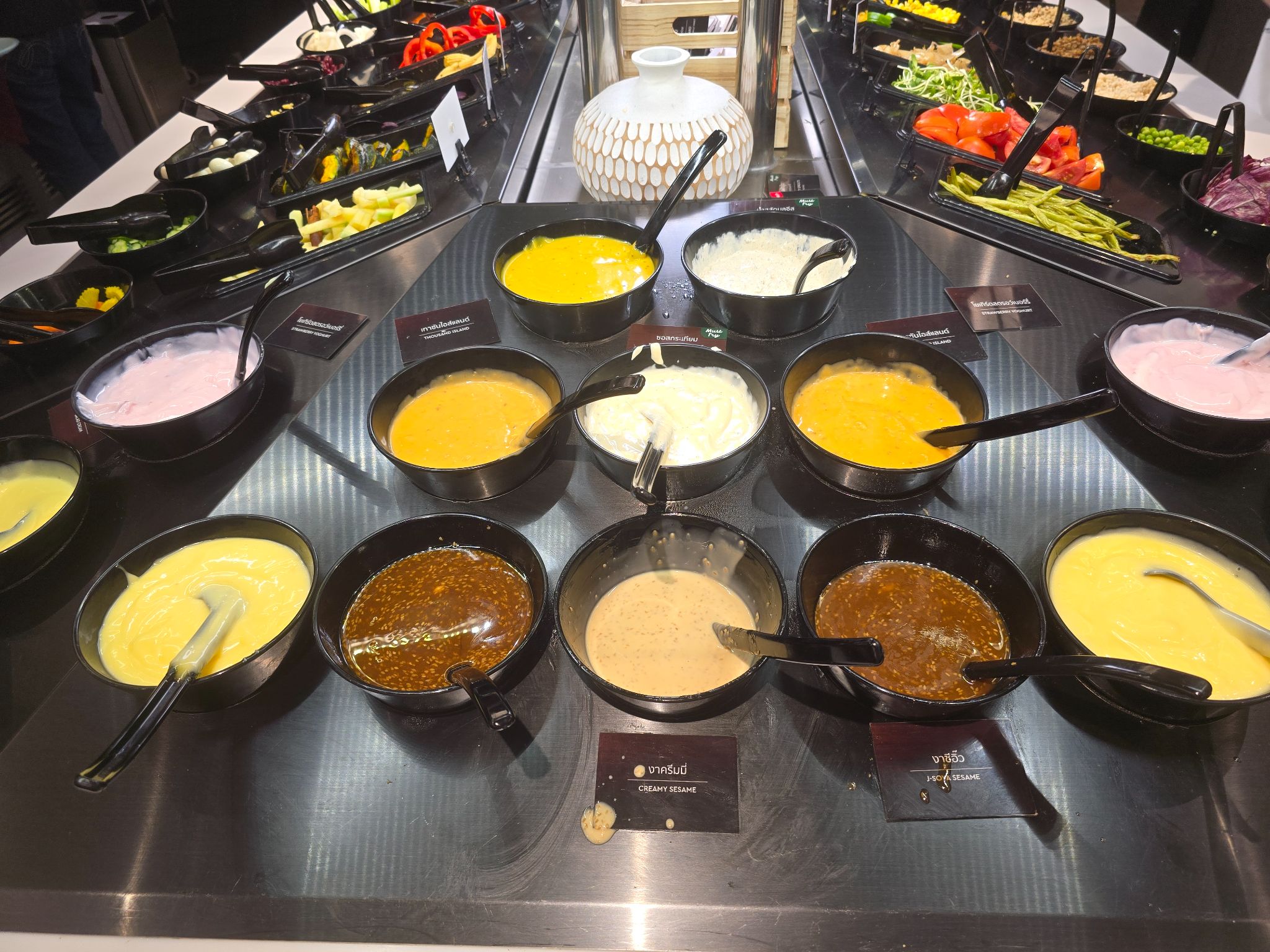 มีเมนูสลัดเพิ่มเติมจากปกติหลายอย่างครับ ที่ชอบก็จะมีข้าวโพดอ่อน สาขาที่ผมเคยไปกินที่ศาลายาเอาออกไปแล้วครับ มีผักแปลก ๆ หลายตัว น้ำสลัดมากกว่าสาขาปกติรวมถึงบลูชีสที่คนว้าวกัน แต่ผมราดแค่น่ำสลัดงาญี่ปุ่นครับ ไม่ได้ชิมตัวอื่น