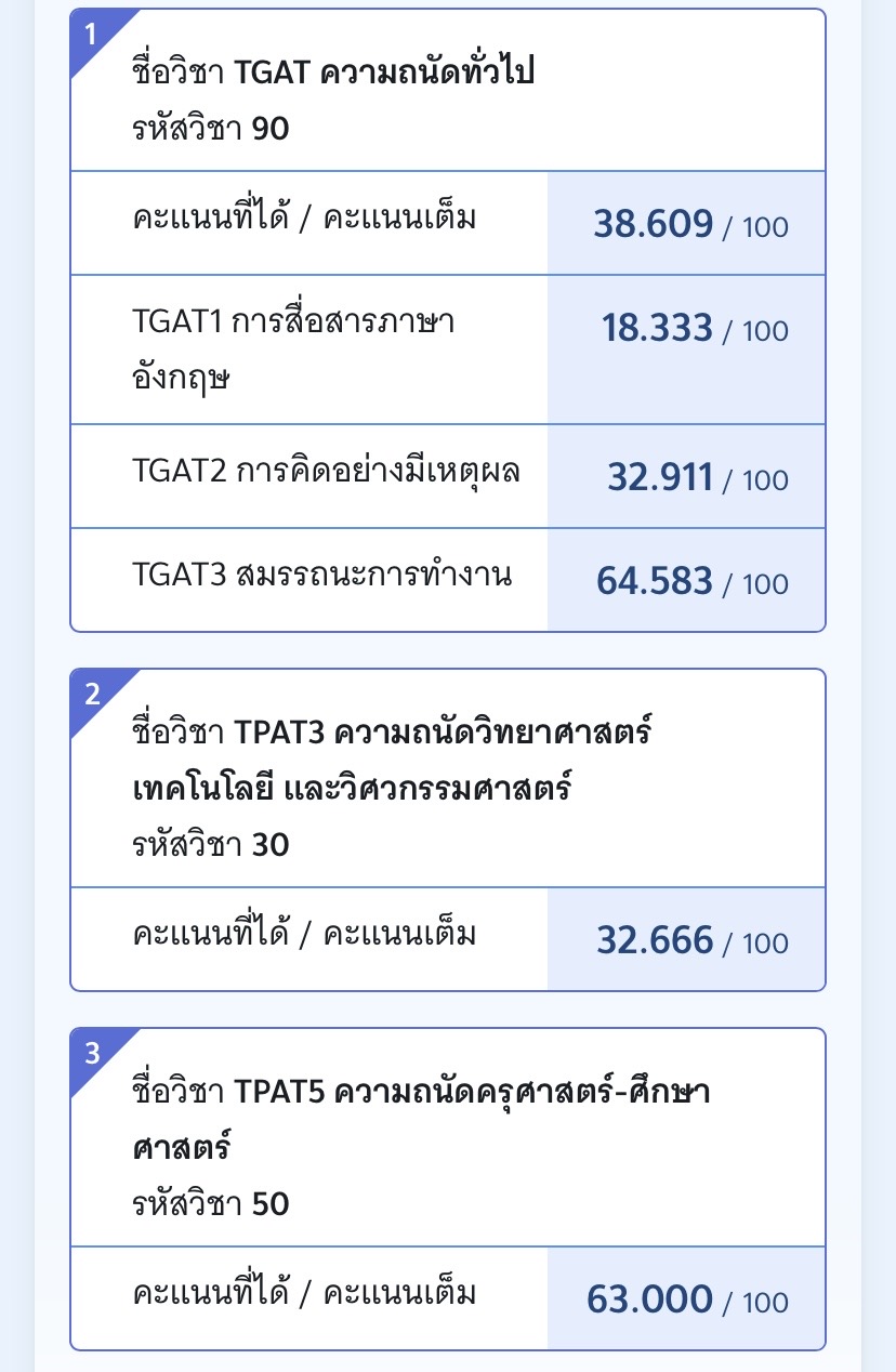 คือผมไปสอบมาเป็น Tgat กับ Tpat3 ผลที่ออกมาคือ gat1 78.333 gat2 24.050(เวลาหมดซะก่อนทำไม่ทัน) gat3 63.333 เอามาคิดเฉลี่ยคะแนนรวมได้ 55.239/100 ส่วน tpat3 ได้ 34.333 ยอมรับว่าพลาดเองที่เอาแต่ทำงานไม่ไ