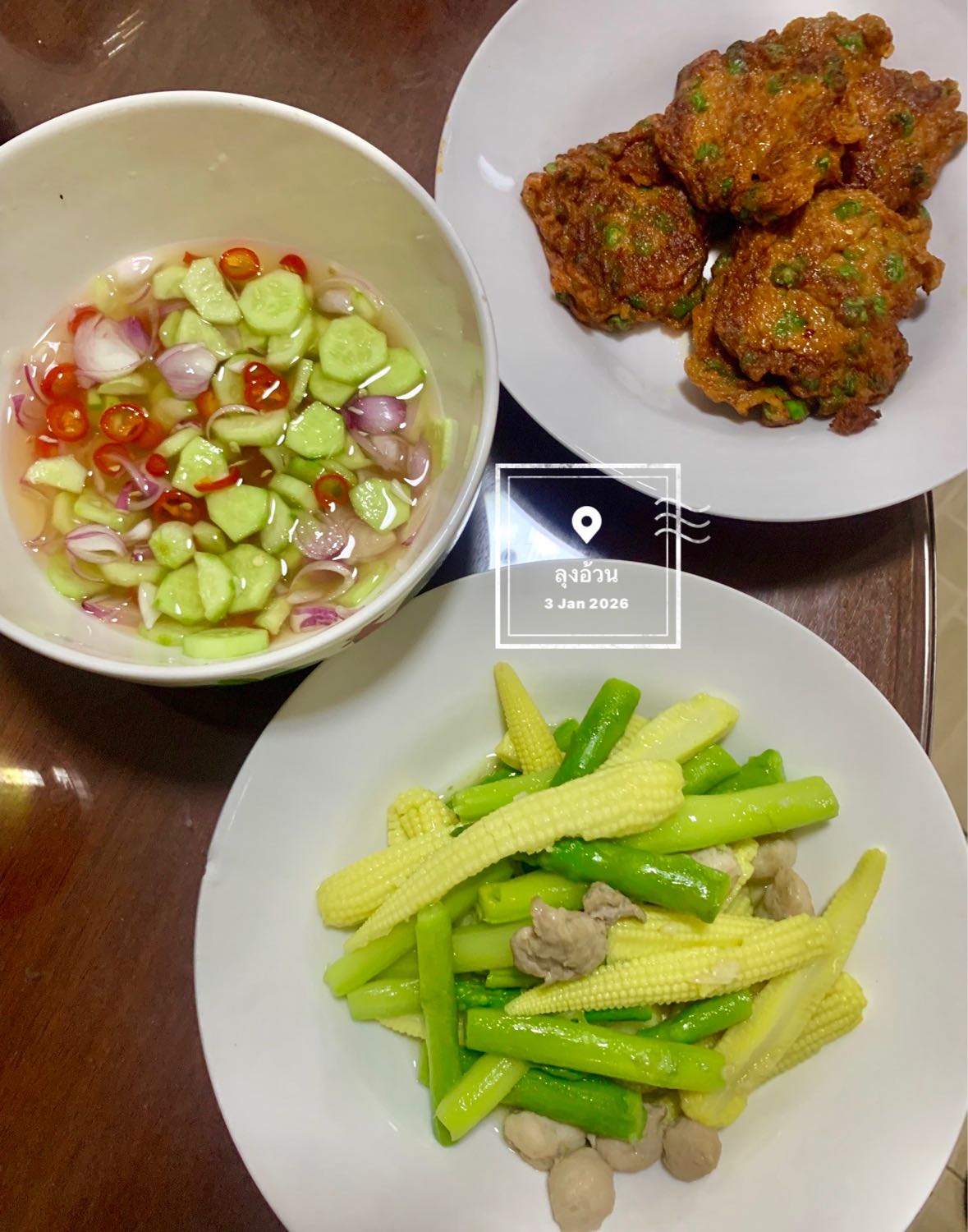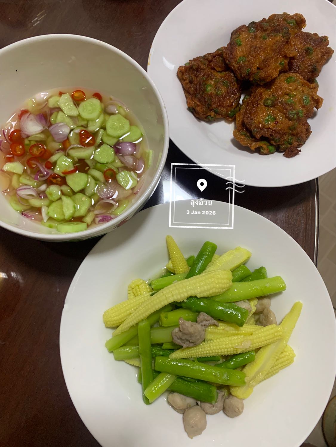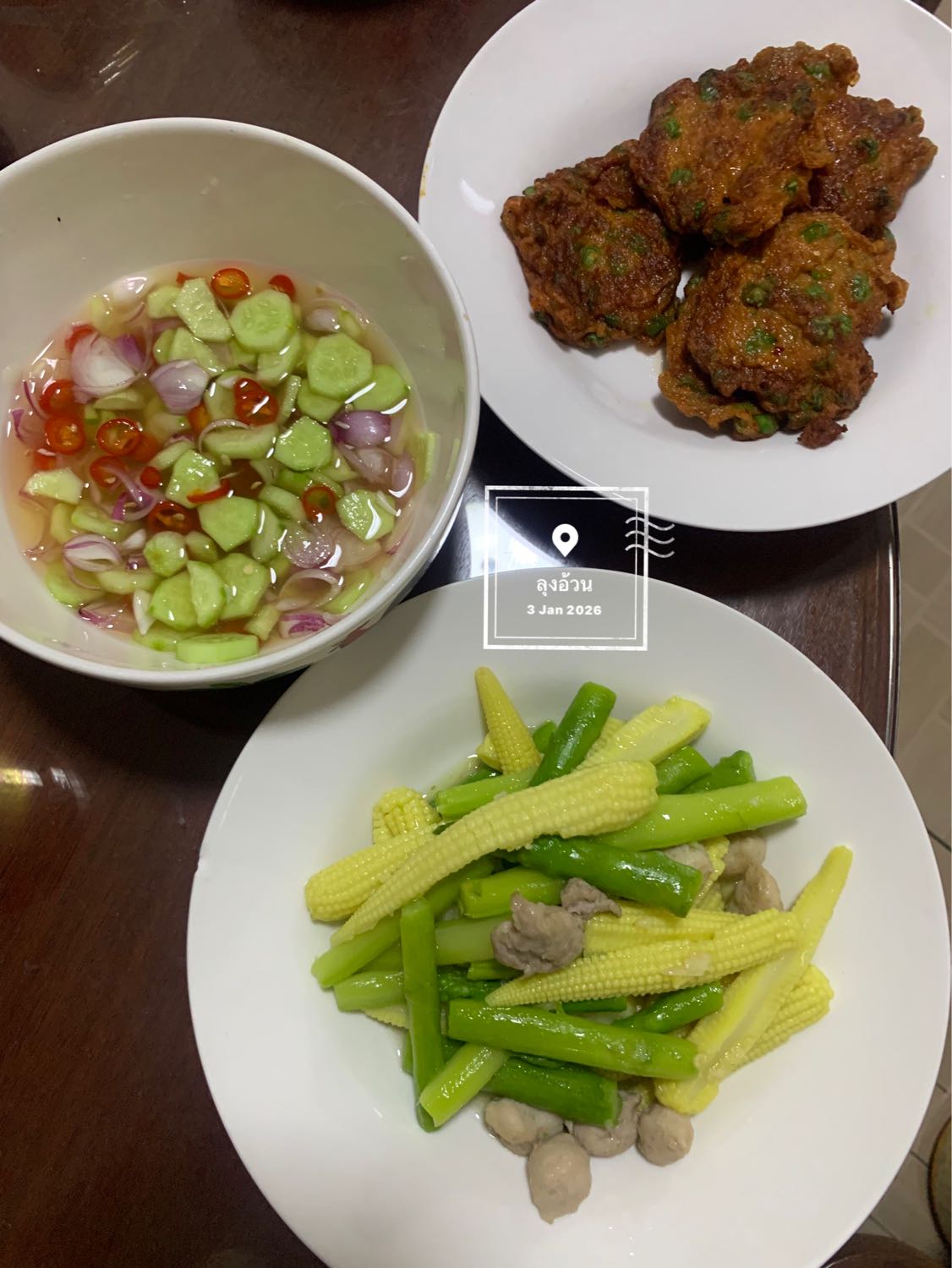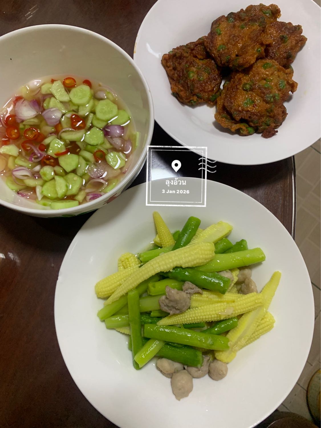 : ทอดมันปลาแปดริ้ว & อาจาดแตงกวา & ผัดหน่อไม้ฝรั่งกับข้าวโพดอ่อน