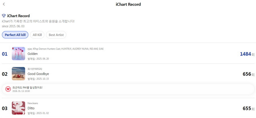 Good Goodbye แซง Ditto ขึ้นเป็นอันดับสองเพลงที่ได้ PAK มากที่สุดในประวัติศาสตร์