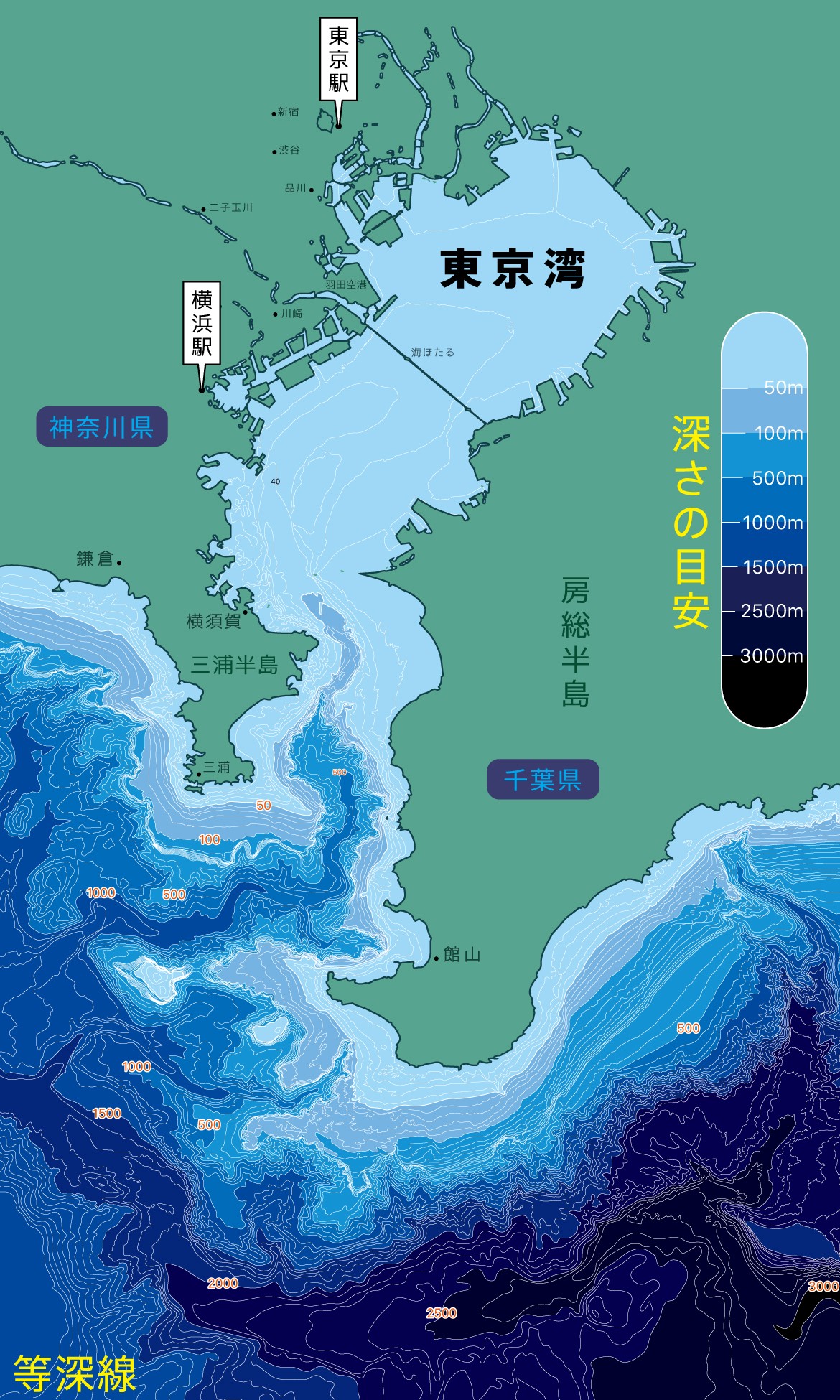 แล่นเรือออกจากอ่าวโตเกียวที่ไม่ได้ลึกมาก ออกแปซิฟิคไปไม่นานก็เจอจุดลึกมาก ๆแล้ว
