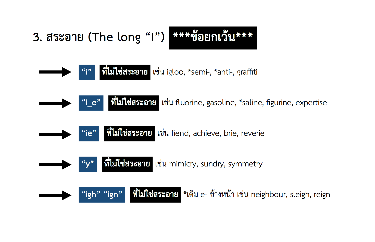 ต้องบอกว่าสำหรับข้อยกเว้นของสระอาย (The Long I) นี้อาจจะต้อง “มองมุมกลับ” ครับ โดยเฉพาะในข้อสอง (-ie) ข้อห้า (-ai) และข้อหก (-ei) เนี่ย จริง ๆ อาจจะต้องบอกว่า... 📌 สระอายต่างหากที่เป็น “ข้อยกเว้น” ของตัวสะกดสองตัวนี้ (เพราะส่วนมากมันไม่ใช่สะอายอยู่แล้ว!)