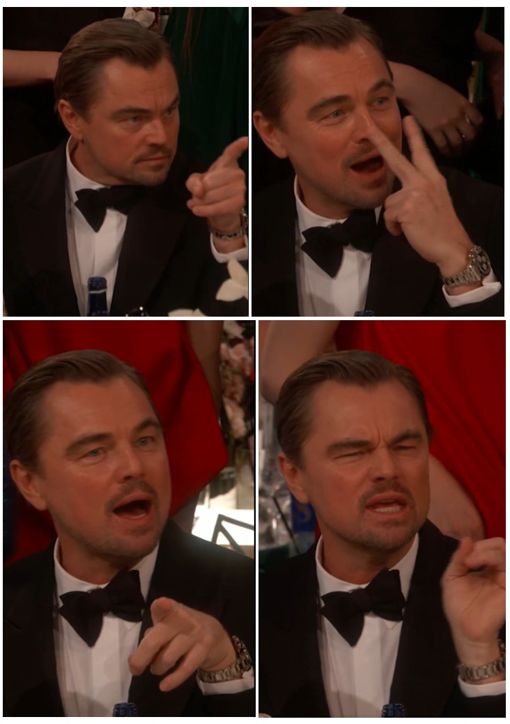 ลีโอนาร์โด ดิแคพรีโอ ในขณะที่เขากำลังออกรสออกชาติในการเม้าท์มอยกับเพื่อนร่วมโต๊ะ จนกลายเป็นไวรัลไปทั่วโซเชียลมีเดีย