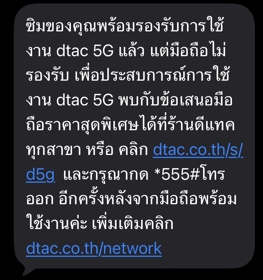 สวัสดีค่ะ จะสอบถามค่ะ คือจะเปิดใช้งาน 5G Dtac ไม่ได่ค่ะ กด *555# SMS แจ้งว่า ซิมของคุณพร้อมรองรับการใช้งาน dtac 5G แล้ว แต่มือถือไม่รองรับ เพื่อประสบการณ์การใช้งาน dtac 5G พบกับข้อเสนอมือถือราคาสุดพิ