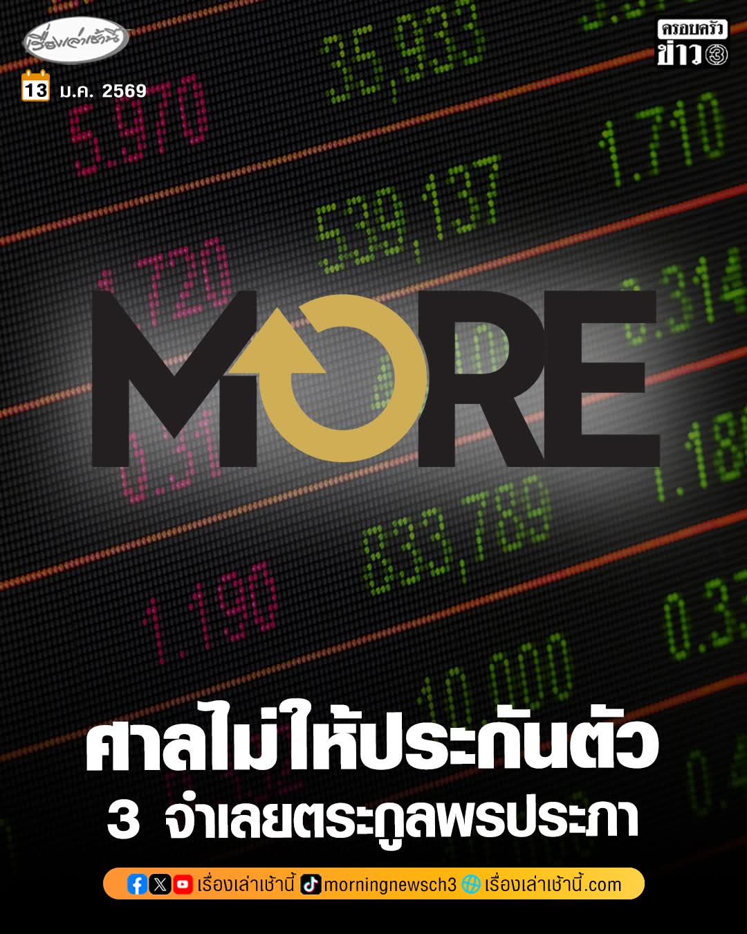 📌📌📌 มหากาพย์ปล้นกลางตลาดหุ้นไทย "คดีหุ้น MORE" ที่สร้างความเสียหายกว่า 4.5 พันล้านบาท เดินทางมาถึงจุดเดือด เมื่อศาลออกหมายจับ 3 ไฮโซดังแห่งตระกูล "พรประภา" หลังเบี้ยวฟังคำสั่งฟ้อ