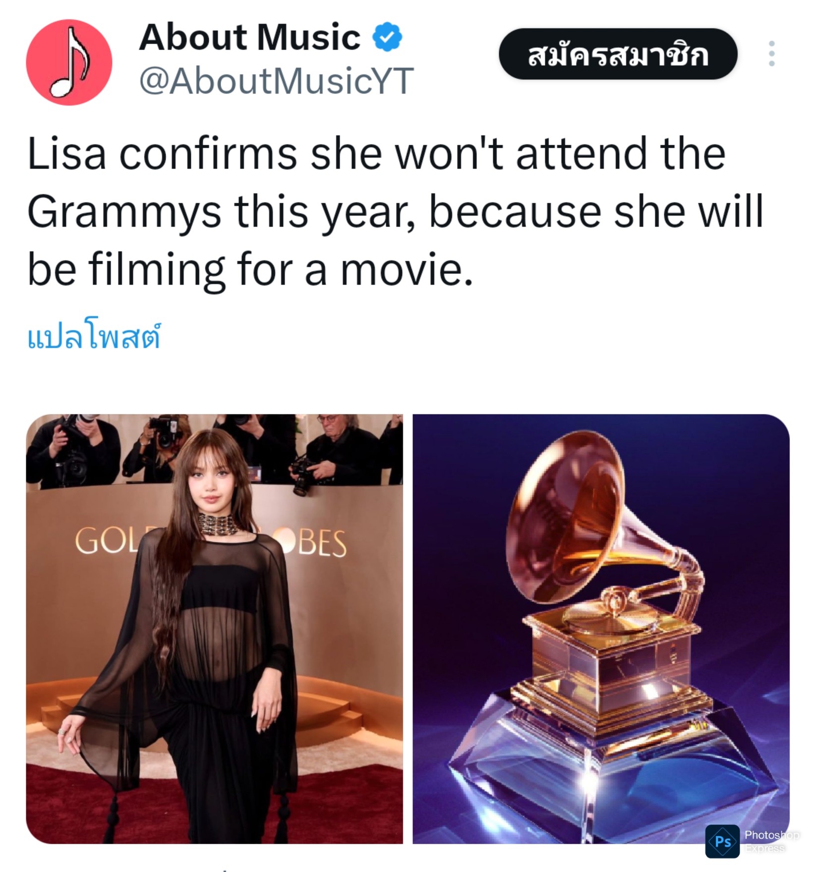 ส่วนนี่คือความน่าเสียดาย ที่ลิซ่าออกมาคอนเฟิร์มเองแล้วว่าไม่สามารถเข้าร่วมงาน Grammy Awards ในปีนี้ได้เพราะติดถ่ายทำภาพยนตร์นั่นเอง