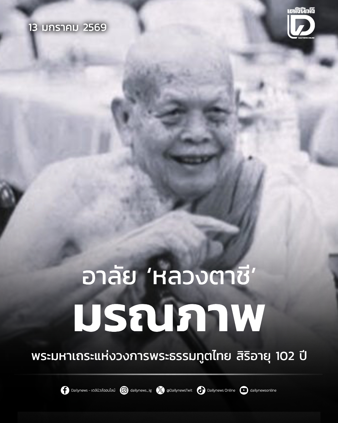 อาลัย ‘หลวงตาชี’ พระมหาเถระแห่งวงการพระธรรมทูตไทย มรณภาพแล้ว สิริอายุ 102 ปี... สามารถติดตามต่อได้ที่ : https://www.dailynews.co.th/news/5498659/