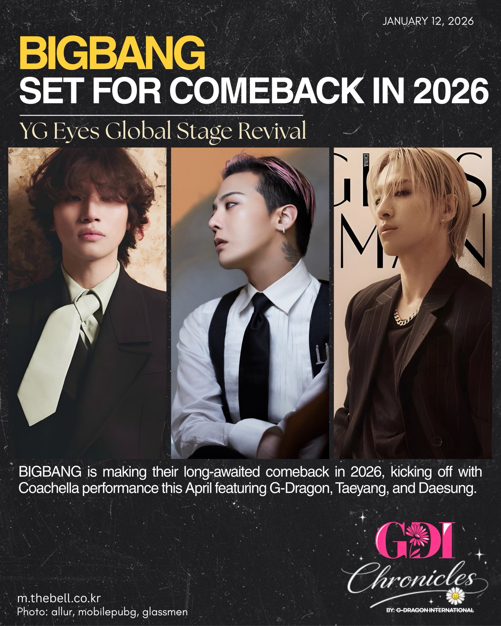 BIGBANG The King of K-POP เตรียมกลับมาสร้างประวัติศาสตร์อีกครั้งในวาระครบรอบอายุวง 20 ปี เริ่มคิกออฟด้วยการแสดงที่ Coachella โดยข่าวจากวงในระบุว่าจะมาพร้อมอัลบั้มเต็มซึ่งจะปล่อยออกมาในเดือนสิงหาคม 2026 หลังจากนั้นก็จะเริ่มเดินสายเวิร์ลทัวร์อย่างเต็มรูปแบบ ทั้งหมดภายใต้