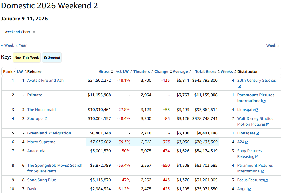 1. Avatar: Fire and Ash / ทำรายได้สุดสัปดาห์ที่ 4 ไป 21.5 ล้านเหรียญ ลดลงจากสัปดาห์ก่อน -48.1% รายได้สุดสัปดาห์นี้น้อยกว่า Avatar: The Way of Water อยู่ -53% จากรายได้สุดสัปดาห์ที่ 4 ไปจนจบการฉาย Avatar: The Way of Water ทำรายได้เพิ่มไปอีก 166.5 ล้าน เท่ากับว่า Avatar: Fire and Ash น่าจะทำรายได้เพิ่มอีกราว 78.3 ล้าน รวมเป็นรายได้สุดท้ายที่ประมาณ 415-425 ล้านเหรียญ