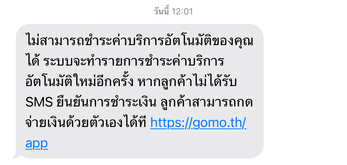 ชำระค่าบริการแพ็คเกจเสริมรายเดือนของ GOMO BY AIS แล้วเงินหักไปแล้วแต่ขึ้นไม่สำเร็จ