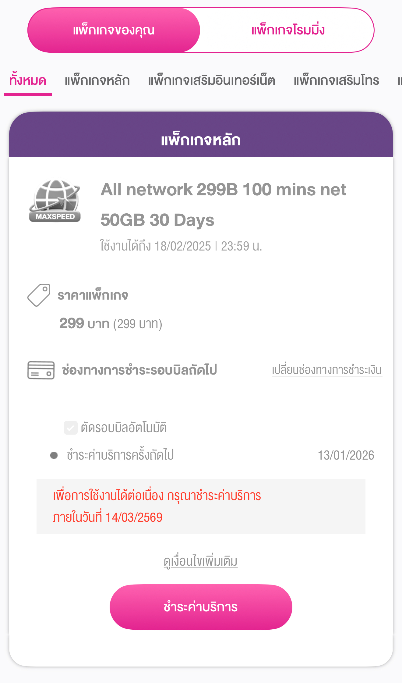 ตอนแรก ปกติเน็ตก็จะตัด หลังจากเติมครบ 280บาท 30วัน 140บาท 15วัน แต่มารอบนี้ ก็เติมปกติ 140บาท แต่มันไม่ยอมหัก เลยเข้าไปดูข้อความก็แจ้งเตือนปกติ แต่มันมี2ข้อความ อันแรก จะต่อแพ็คเกจให้ต่อเนื่อง ในวันที
