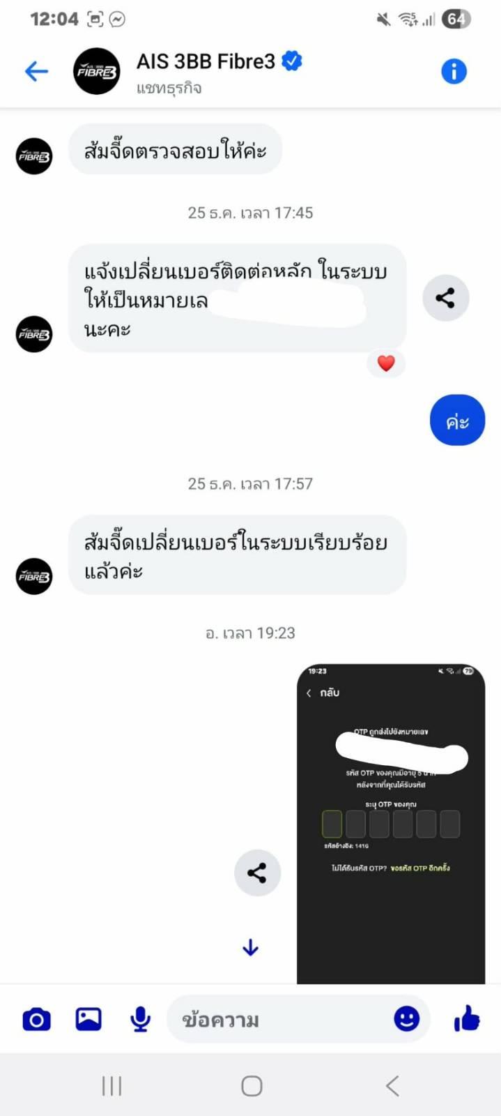 วันนี้เราทำใหม่อีกรอบ มันยังส่ง OTP ไปเลขเดิม เราทักไปรอบสอง ทางเพจบอกรับเรื่องให้ แต่ผ่านมาสักพัก เราลองเข้าใหม่มันยังส่งเลข OTP ไปที่ 081